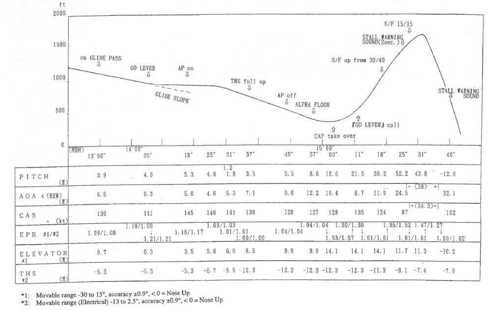 최종적으로 피치각은 52도까지 증가했고, 대기 속도는 87kn까지 감소했다. 그 후, 기체는 실속하여 급강하했고, 11시 15분 (JST 20시 15분) 45초에 활주로 34에서 동북동 110m 지점의 착륙대에 추락했다.[25]