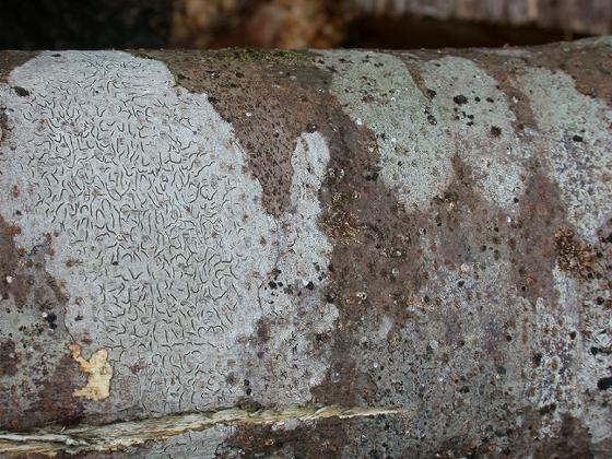 - 가상지의류: 엽상지의와 비슷하지만, 뒷면에 하피층이 없고, 지의체가 기질에 밀착하거나 스며든 것처럼 보인다. 사암 등에서는 지의체가 기질과 완전히 일체화되기도 한다. 약간 색깔이 있거나, 자실체만 나란히 있는 것처럼 보이기도 한다. 전체적으로 원형이며, 바깥쪽으로 성장한다. 자실체는 표면에 위쪽으로 늘어선다.