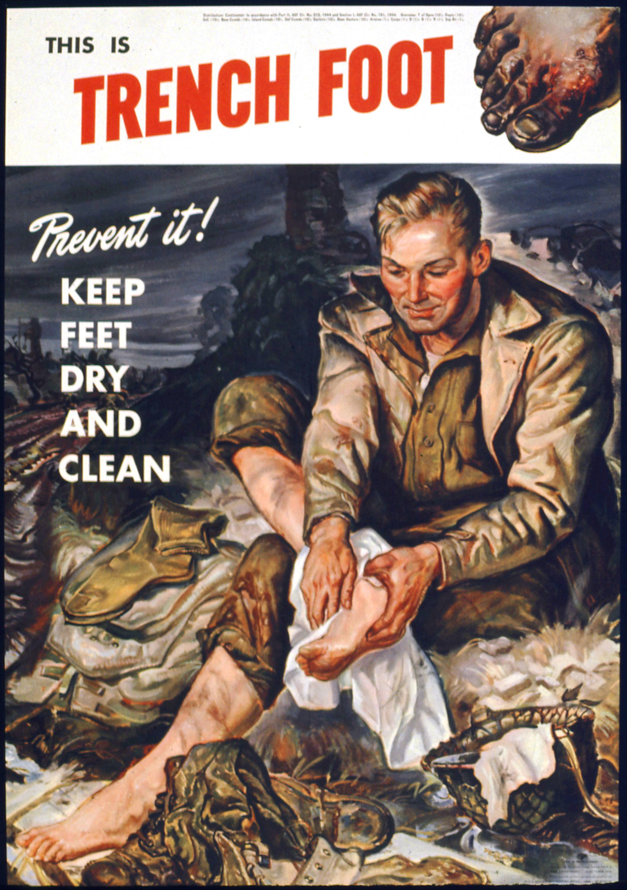 제1차 세계 대전의 겨울 동안 참호전에서 병사들에게 특히 문제가 되었으며,[31] 제2차 세계 대전, 베트남 전쟁으로 이어졌다. 제1차 세계 대전 당시 참호전의 유행으로 인해 이 질병에 붙여진 비공식적인 이름은 ''참호족''이었다.[1] 공식 통계에 따르면 이 질환으로 영국군 약 75,000명, 미군 2,000명이 사망했다.[7]