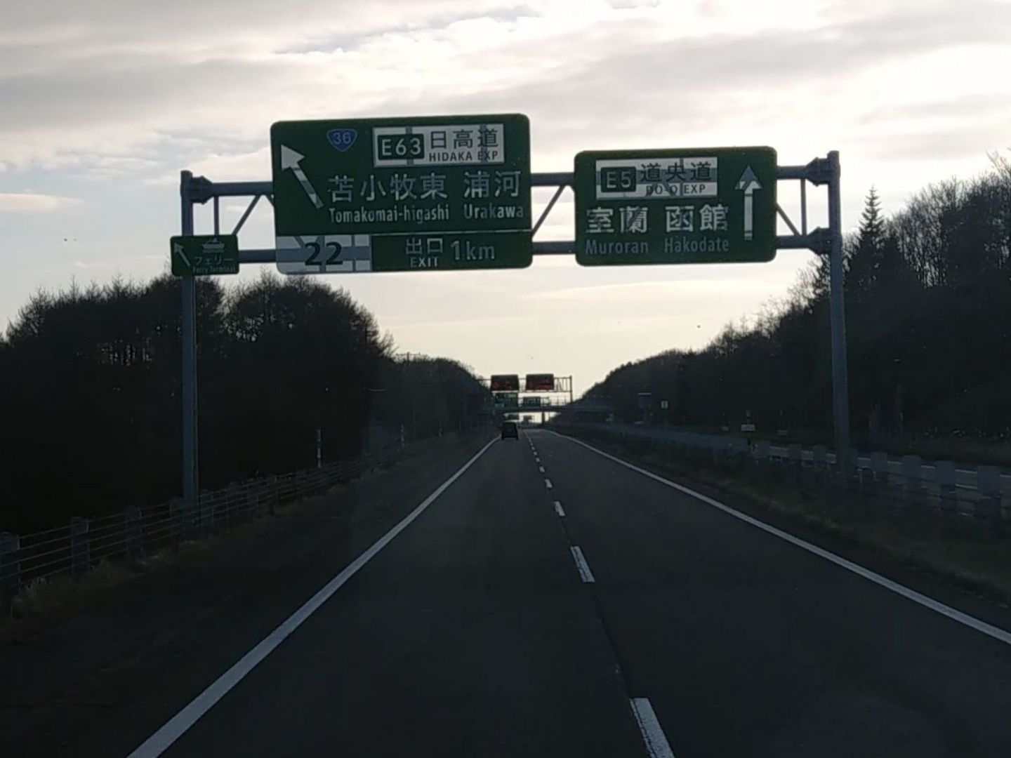 방면 및 출구 예고(110-A)와 방면 및 방향(108의 2-D)의 흰색 부분에 역광 대책으로 펀칭 메탈을 사용한 표지판 (도오 자동차도 홋카이도도마코마이시)