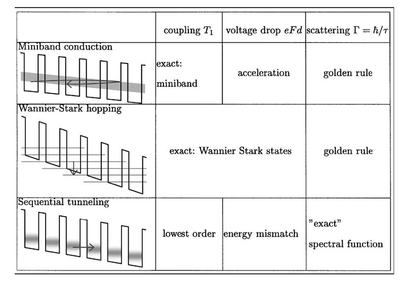 초격자 구조에 전기장 ''F''를 가하면 해밀토니안에 추가적인 스칼라 포텐셜 ''eφ''(''z'') = −''eFz''가 나타나며, 이는 병진 불변성을 파괴한다. 이 경우, 파동 함수 와 에너지 를 갖는 고유 상태가 주어지면, 파동 함수 에 해당하는 상태들의 집합은 에너지 ''E''''j'' = ''E''0 − ''jeFd''를 갖는 해밀토니안의 고유 상태가 된다. 이러한 상태들은 에너지와 실 공간 모두에서 고르게 간격을 두고 있으며, 소위 완니에-스타크 사다리를 형성한다. 무한 결정에 대해서는 포텐셜 가 유계가 아니므로 연속적인 에너지 스펙트럼을 의미한다. 그럼에도 불구하고, 이러한 완니에-스타크 사다리의 특징적인 에너지 스펙트럼은 실험적으로 확인될 수 있다.5. 6. 수송 특성