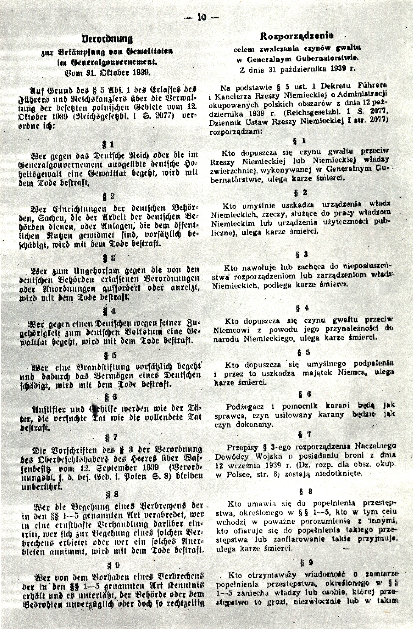 독일군 침략 이후 1940년 초까지 폴란드에서는 독일 군사 재판소를 제외한 어떤 법원도 운영되지 않았다. 이후 폴란드 사법 체계가 재건되어 독일의 이익과 관련되지 않은 사건을 판결했지만, 독일 사법 체계도 병행하여 수립되었다. 두 체계의 관할권이 겹치는 경우 독일 사법 체계가 우선했다.폴란드인, 특히 유대인을 차별하는 새로운 법률이 제정되었다. 1941년에는 새로운 형법이 도입되어 많은 범죄에 사형이 적용되었다. 예를 들어 1939년 10월 31일에는 독일 정부에 대한 모든 행위에 대해, 1940년 1월 21일에는 경제적 투기에 대해, 1940년 2월 20일에는 성병 유포에 대해, 1941년 11월 10일에는 유대인에게 도움을 주는 행위에 대해 사형이 도입되었다.