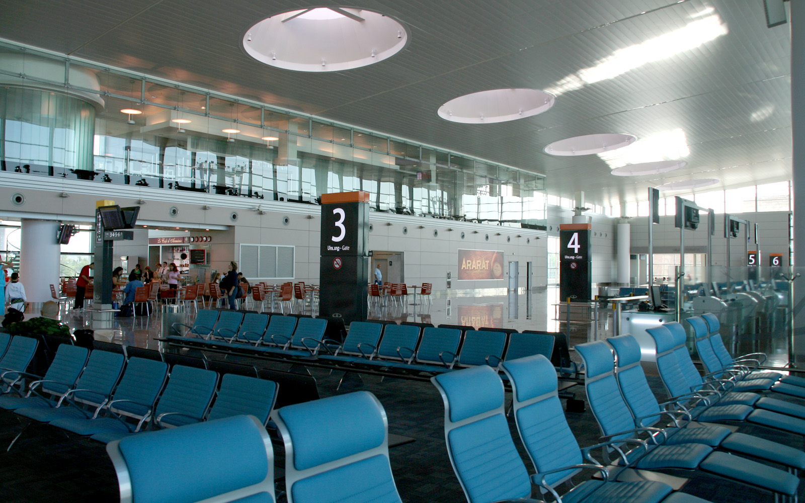 탑승 구역 접근은 사전 통제, 여권 통제, X-레이 통제의 세 단계로 고도로 보안이 유지된다. 공항에는 보안 검색 후 듀프리 면세점과 게이트 구역 및 앞치마가 내려다보이는 컨버스 은행 비즈니스 클래스 라운지가 있다. 또한, 공항에는 하이포스트 사무소, 약국, 여러 식당과 카페, 유로카, 비라인, 비바셀 MTS, 아르신뱅크, HSBC, VTB 은행, 아메리아뱅크 ATM이 있다.