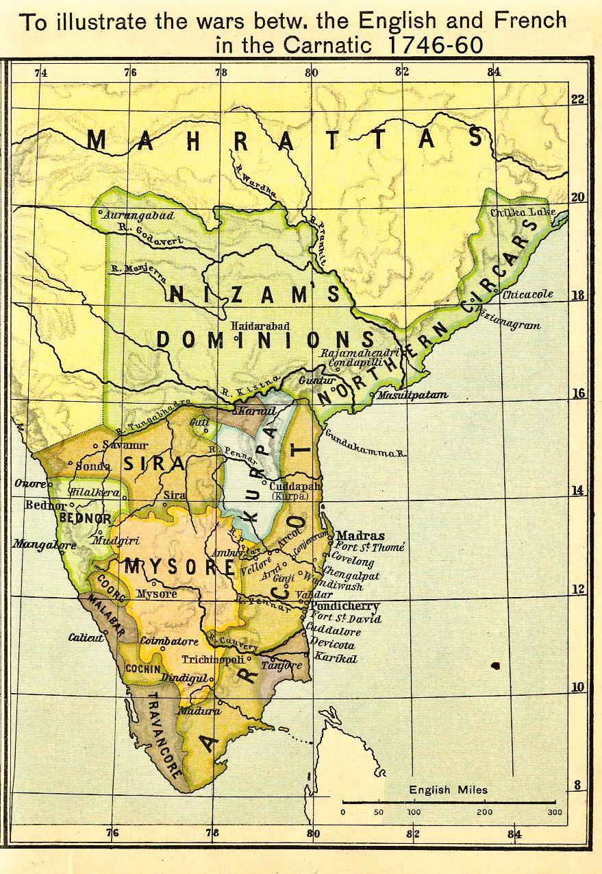 17세기 후반에 절정기를 맞았던 무굴 제국은 1707년 아우랑제브의 사망으로 분열되었다. 영국 동인도 회사는 마드라스에, 프랑스 동인도 회사는 퐁디셰리를 거점으로 세력을 확장하며 경쟁했다. 1713년 이후 카르나타카 태수는 제국에서 사실상 독립하여 카르나타카 지역을 지배했다.