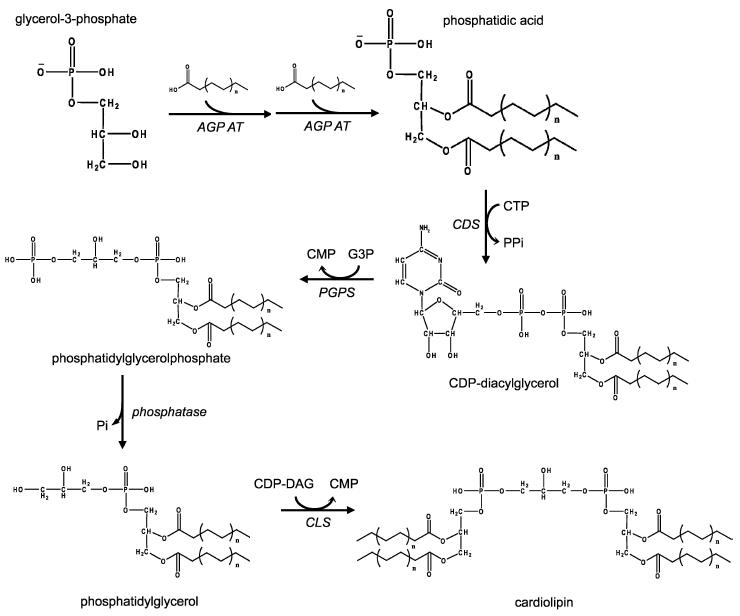 진핵생물에서 효모, 식물 및 동물과 같은 카르디올리핀 생합성 과정은 미토콘드리아에서 일어나는 것으로 여겨진다. 첫 번째 단계는 글리세롤-3-인산에 글리세롤-3-인산 아실트랜스퍼라제가 아실화되는 것이다. 그런 다음 아실글리세롤-3-인산은 다시 아실화되어 포스파티드산(PA)을 형성한다. CDP-DAG 합성 효소(CDS) (포스파티데이트 시티딜릴트랜스퍼라제)의 도움으로 PA는 시티딘 디포스페이트-디아실글리세롤(CDP-DAG)로 전환된다. 다음 단계는 PGP 합성 효소에 의해 CDP-DAG를 포스파티딜글리세롤 인산(PGP)으로 전환한 다음 PTPMT1 [13]에 의한 탈인산화로 PG를 형성하는 것이다. 마지막으로, CDP-DAG 분자는 미토콘드리아에 국한된 효소 카르디올리핀 합성 효소(CLS)에 의해 촉매되어 PG에 결합하여 카르디올리핀 1분자를 형성한다.[2][3][14]3. 2. 원핵생물의 카르디올리핀 합성