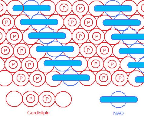 머리 부분이 이러한 조밀한 이환식 구조를 형성하기 때문에, 머리 부분의 면적은 4개의 아실 사슬로 구성된 큰 꼬리 부분에 비해 상당히 작다. 이러한 특수한 구조를 기반으로, 형광 미토콘드리아 지표인 노닐 아크리딘 오렌지(NAO)가 1982년에 도입되었으며,[7] 이후 CL에 결합하여 미토콘드리아를 표적으로 하는 것으로 밝혀졌다. NAO는 카르디올리핀의 작은 머리와 큰 꼬리 구조를 보완하고 고도로 정렬된 방식으로 배열될 수 있는 매우 큰 머리와 작은 꼬리 구조를 가지고 있다.[8]