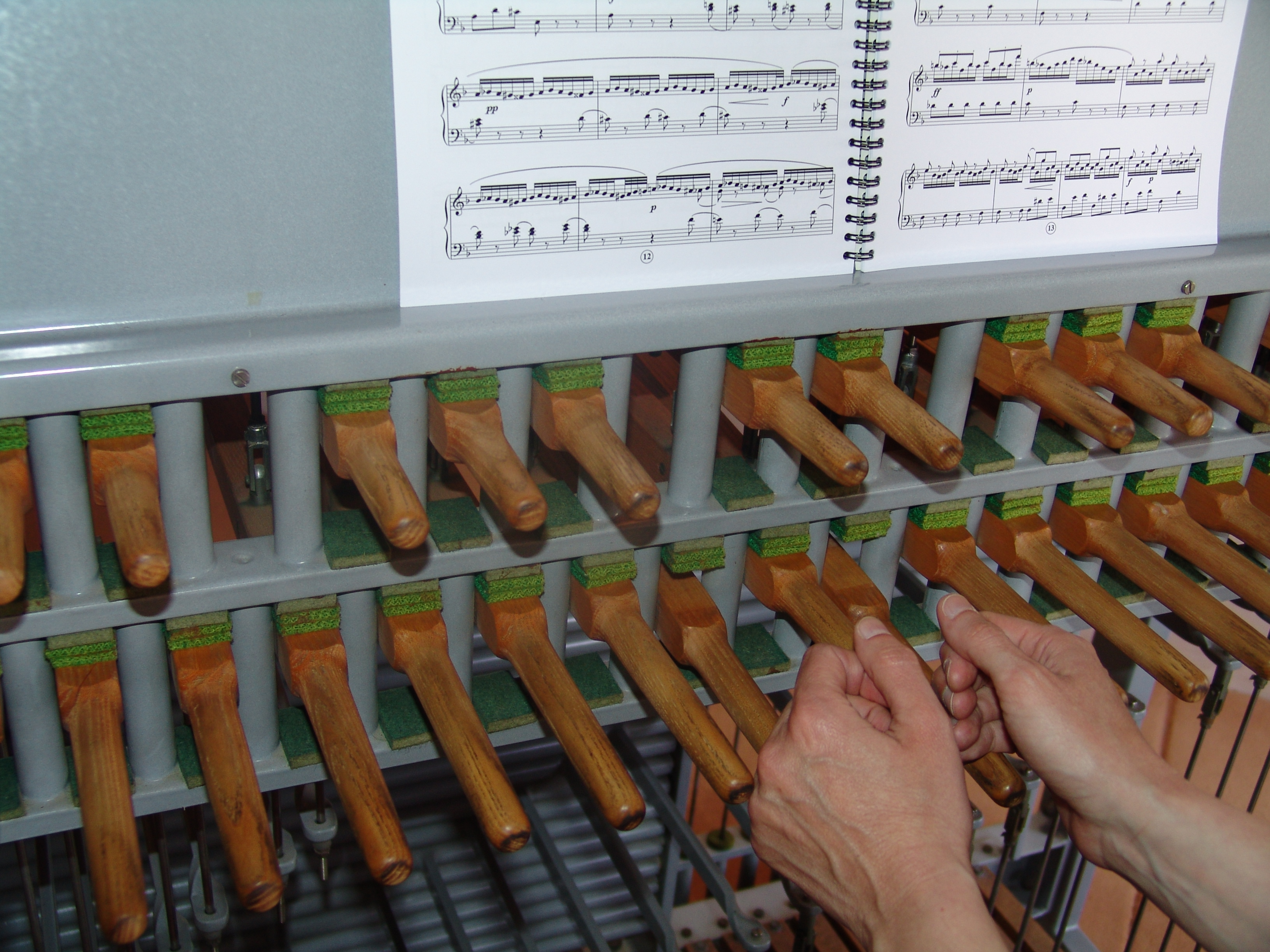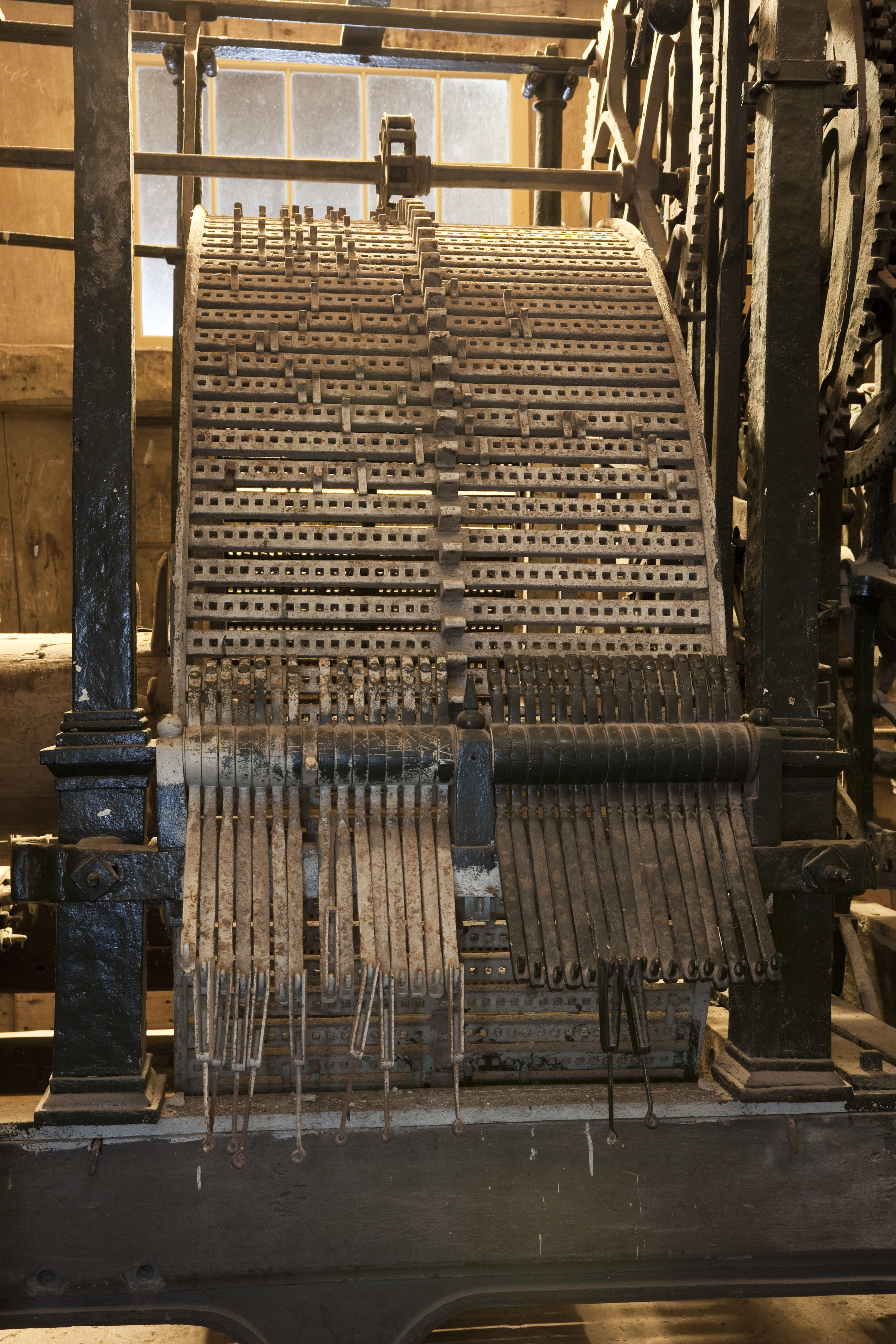 건반의 각 키는 스테인리스강 와이어로 된 전달 시스템에 연결되어 있다. 키를 누르는 힘으로 와이어를 당기고, 도르래를 통해 클래퍼(종의 설)를 움직여 소리를 낸다. 작은 종에는 클래퍼를 원래 위치로 되돌리기 위한 복귀 스프링이 설치되어 있다. 건반 바로 위에는 턴버클(조임 나사)이라고 하는 와이어 조절 기구가 있다.[56]3. 1. 2. 종의 수용