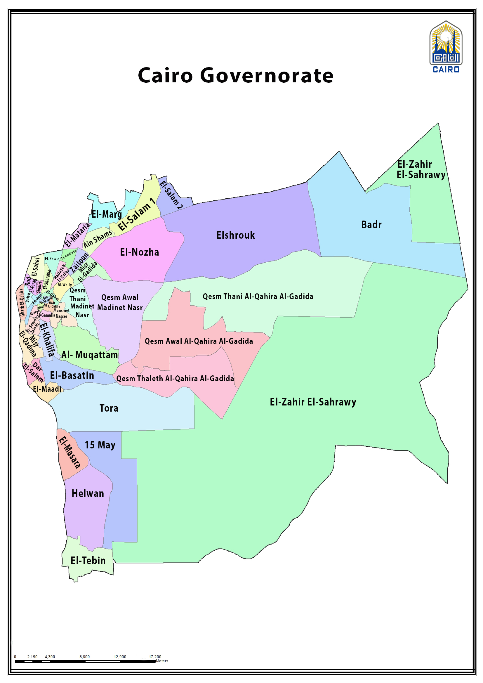 - 마스르 엘카디마 (구 카이로), 알칼리파, 알모카탐, 알바스타인, 다르 엘살람, 엘사이다 자이나브, 알테빈, 헬완, 알마사라, 알마아디, 토라, 5월 15일 도시