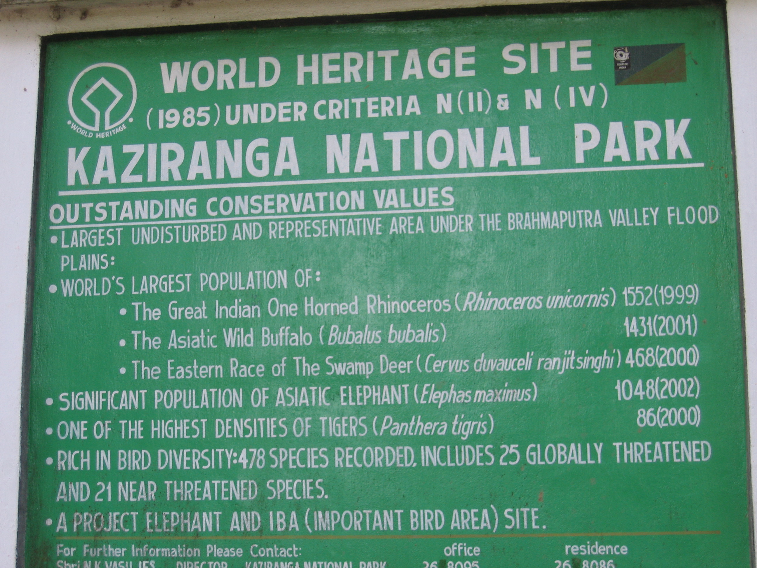 카지랑가 국립공원은 인도 아삼 주에 위치한 국립공원으로, 1904년 메리 커존 여사의 노력으로 보호 구역으로 지정된 것이 시초이다. 1985년 유네스코 세계유산으로 지정되었으며, 인도코뿔소, 아시아 물소, 동부 습지사슴 등 다양한 야생동물의 서식지이다. 브라마푸트라 강의 범람과 밀렵, 수질 오염 등의 문제에 직면해 있으며, 야생 동물 관찰을 위한 관광 활동이 이루어진다.