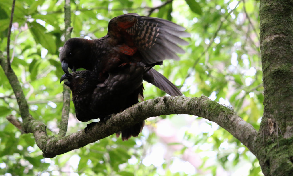 뉴질랜드 카카 한 쌍이 서로에게 먹이를 토해주는 모습