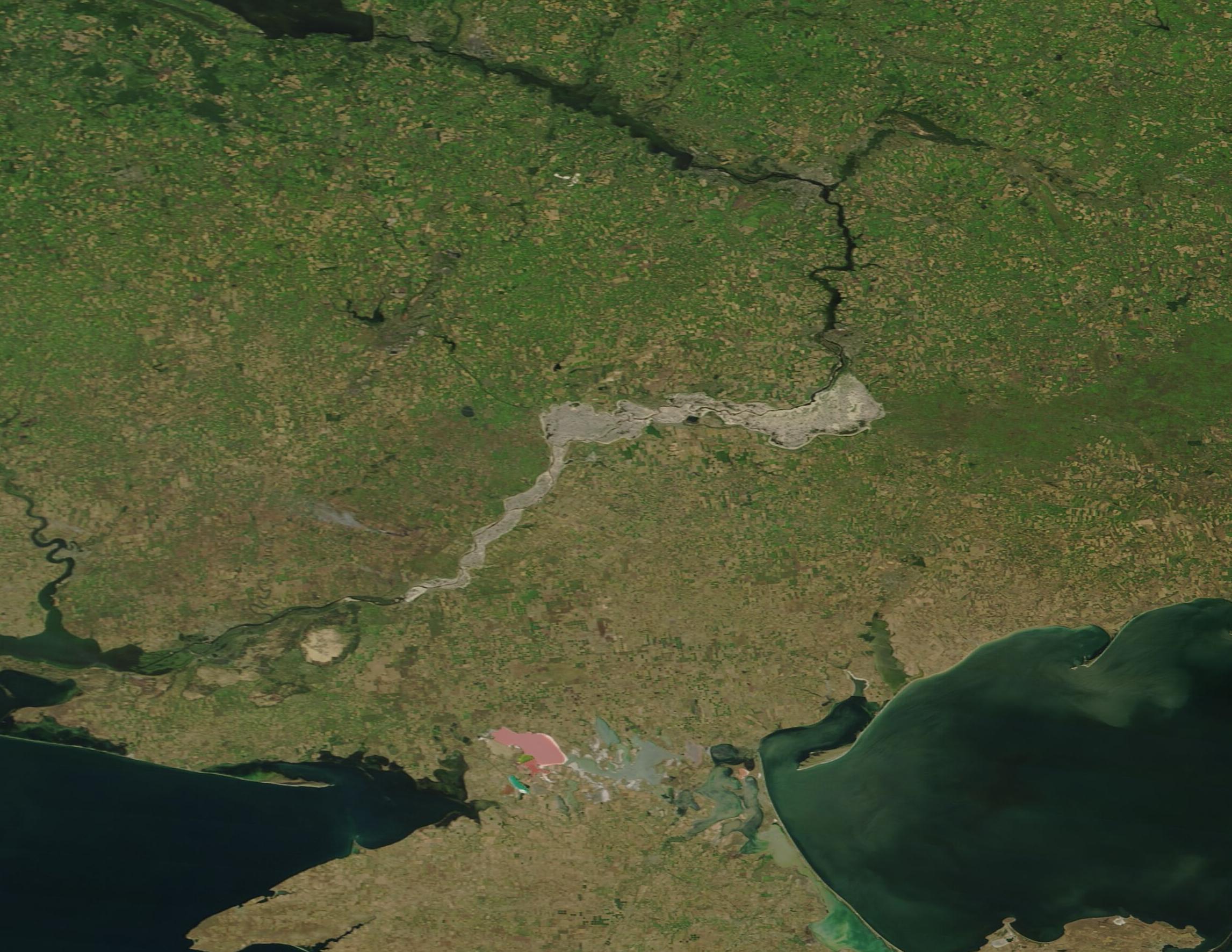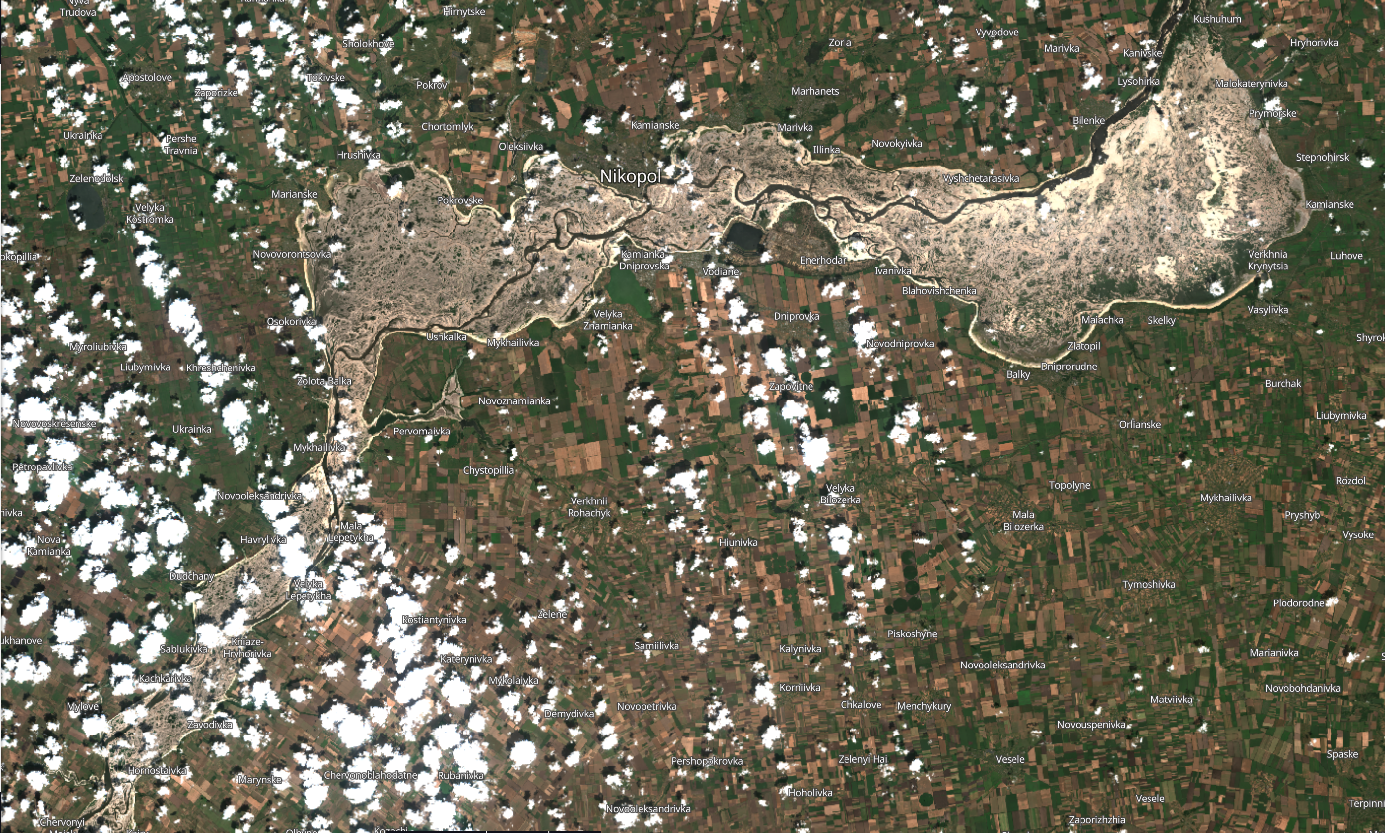 2023년 8월 8일의 카호우카 저수지 위성 사진. 완전히 말라 대초원이 드러났다.