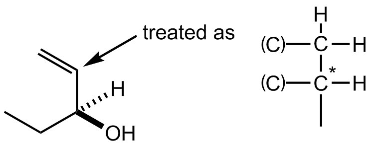 • -CH=CH2 > -CH(CH3)2: 거리 2 목록은 (C, 가상의 C, H) 와 (C, C, H) 로서 우선 순위가 동일하다. 하지만 거리 3에서 목록은 각각 ((가상의 C, H, H), ( ), ( )) 와 ((H, H, H), (H, H, H), ( ))가 된다. 이때 가상의 탄소는 -CH=CH2 의 이중 결합에서 역방향의 결합을 나타내는 것이고 이로 인해 우선 순위가 결정된다.