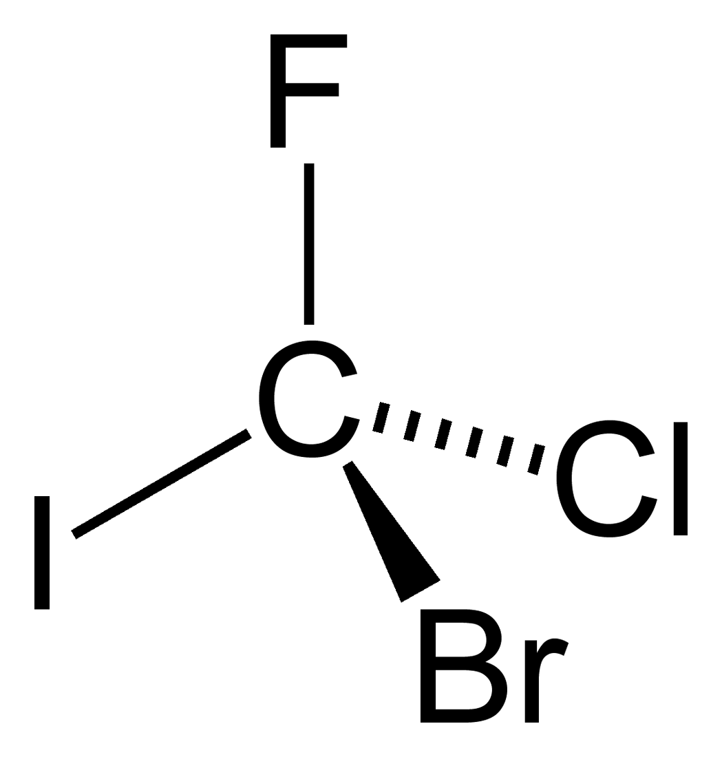 가상의 분자 브로모클로로플루오로아이오도메테인은 (R)-구성을 보이며, 매우 간단한 키랄 화합물이다. 우선순위는 원자 번호 (Z)에 따라 할당된다: 아이오딘 (Z = 53) > 브로민 (Z = 35) > 염소 (Z = 17) > 플루오린 (Z = 9). 플루오린(가장 낮은 우선순위, 번호 4)이 관찰자로부터 멀어지도록 하면 회전은 시계 방향이므로 R이 할당된다.