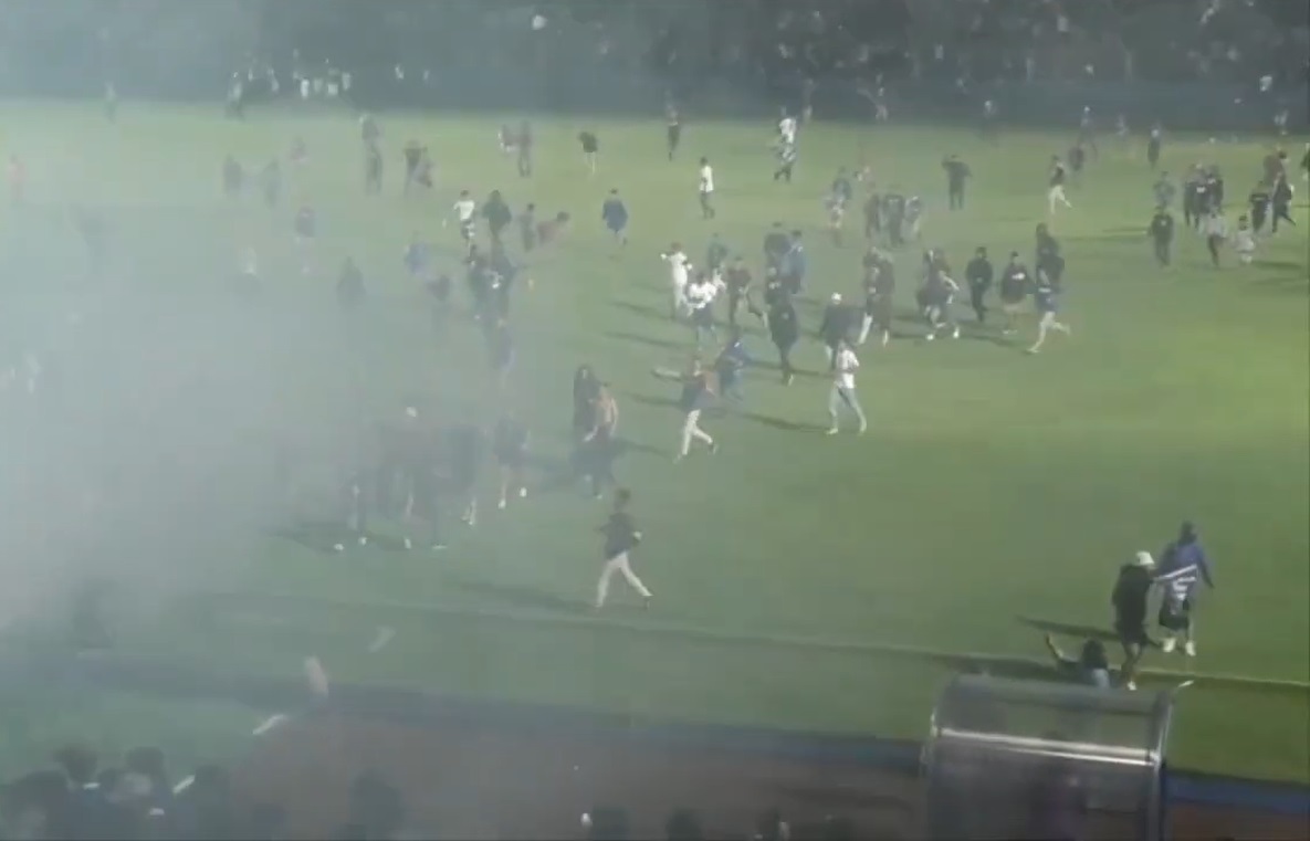 결국 약 3,000명의 아레마니아(아레마 FC 서포터)가 경기장 난입을 감행했다.[31][27] 경기장에 난입한 팬들은 선수와 구단 관계자들을 찾아다니며 오랜 홈 무패 기록이 깨진 것에 대한 해명을 요구했다.[28] 보안 요원과 경찰이 팬들을 경기장 밖으로 내보내려 했으나 실패했고, 상황이 악화되자 인도네시아 육군(TNI-AD)과 기동대 폭동 진압 부대(PHH)까지 투입되었다.[30] 그러나 흥분한 팬들은 물건을 던지고 경찰 차량을 파손했으며 경기장 시설에 불을 지르려 시도하는 등 폭력적으로 저항했다.[31][29] 이 과정에서 페르세바야 선수단은 라커룸으로 긴급히 피신했고, 이후 경찰의 장갑차 안에서 약 1시간 동안 대기한 후에야 경기장을 빠져나갈 수 있었다.[30]