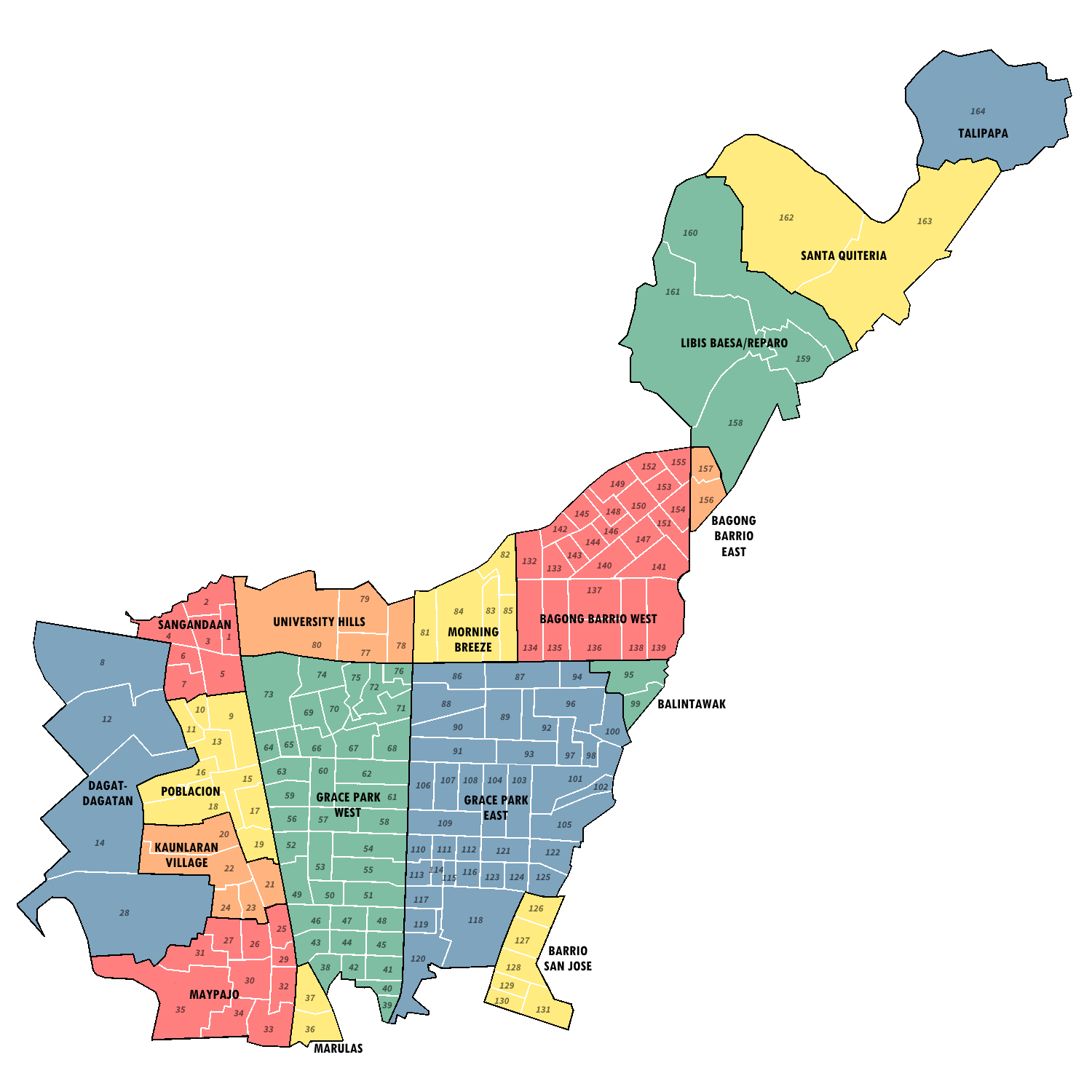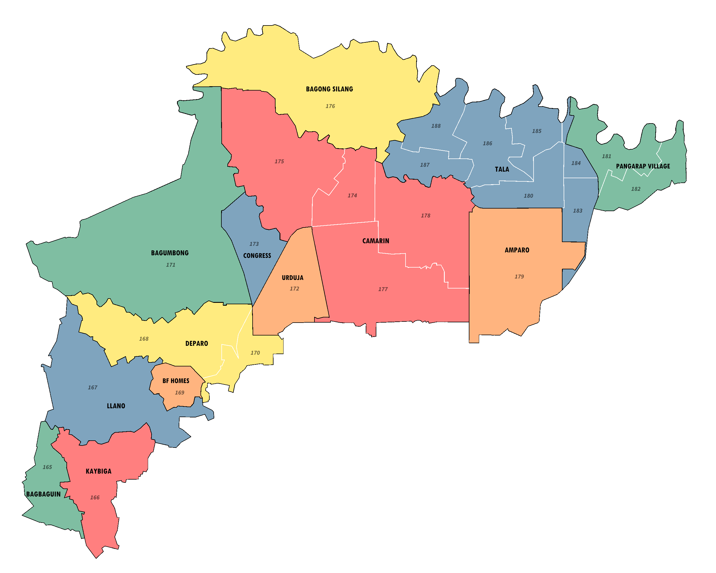 1949년, 의회는 칼로오칸-케손 시 경계를 재정의하는 공화국법 제392호를 통과시켰다.[20] 바에사, 상간다안, 탈리파파, 산 바르톨로메, 파송 타모, 노발리체스 프로퍼(포블라시온), 반랏(현재의 탄당 소라), 카부야오, 푸가드 라윈, 바그바그, 파송 푸틱의 바리오가 칼로오칸에서 분리되었다. 노발리체스의 나머지 부분은 현재 북부 칼로오칸이라고 불린다.[21] 이로 인해 칼로오칸은 두 부분으로 나뉘었다.
