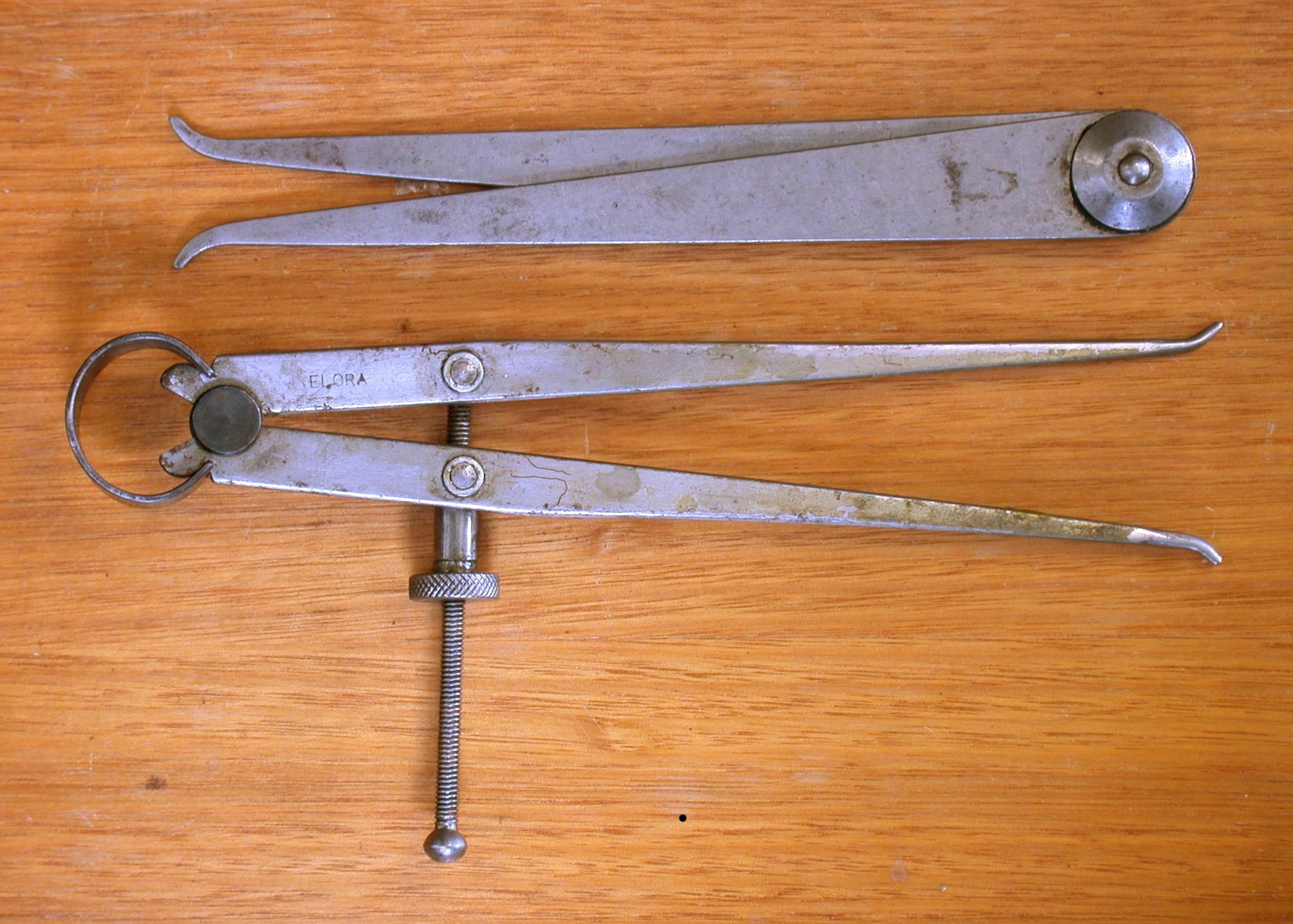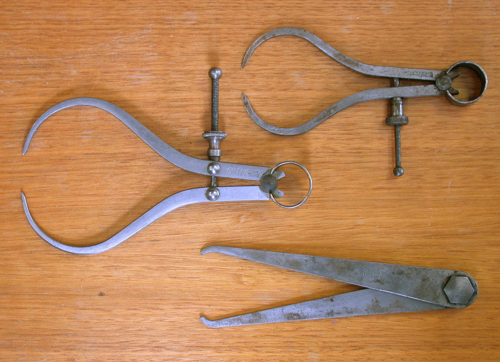 - '''외경 캘리퍼스''': 물체 외부 직경을 측정한다. 다리가 안쪽으로 구부러져 있다.