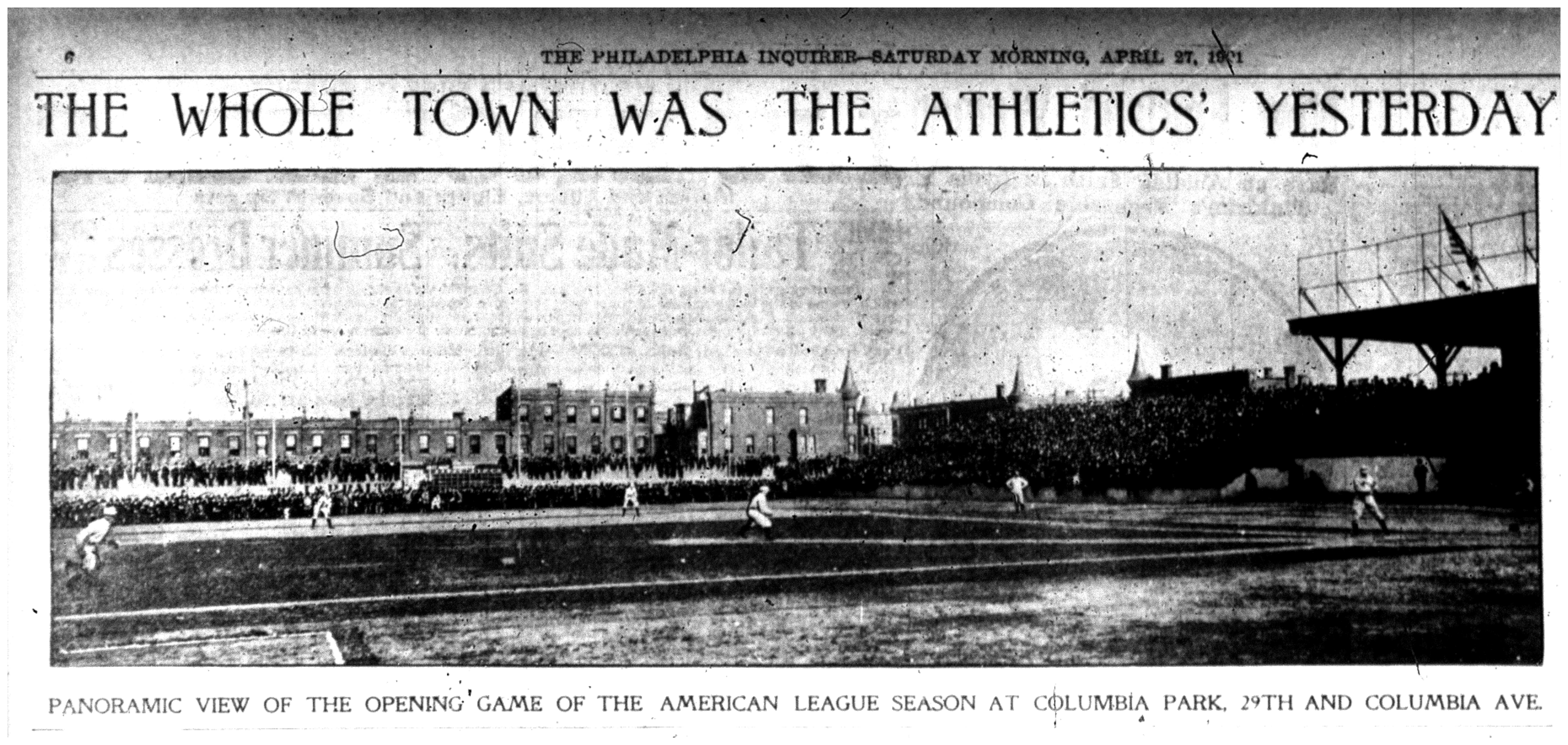 컬럼비아 파크에서 열린 첫 번째 공식 경기는 처음 두 경기가 비로 취소된 후 1901년 4월 26일에 열렸다. 애슬레틱스는 워싱턴 세너터스와 10,524명의 관중 앞에서 경기를 치렀으며, 일부 팬들은 외야 벽과 인근 주택의 지붕에 서 있었다. 애슬레틱스는 2루수 냅 라조이가 3안타를 쳤음에도 불구하고 5-1로 패했다.[5]