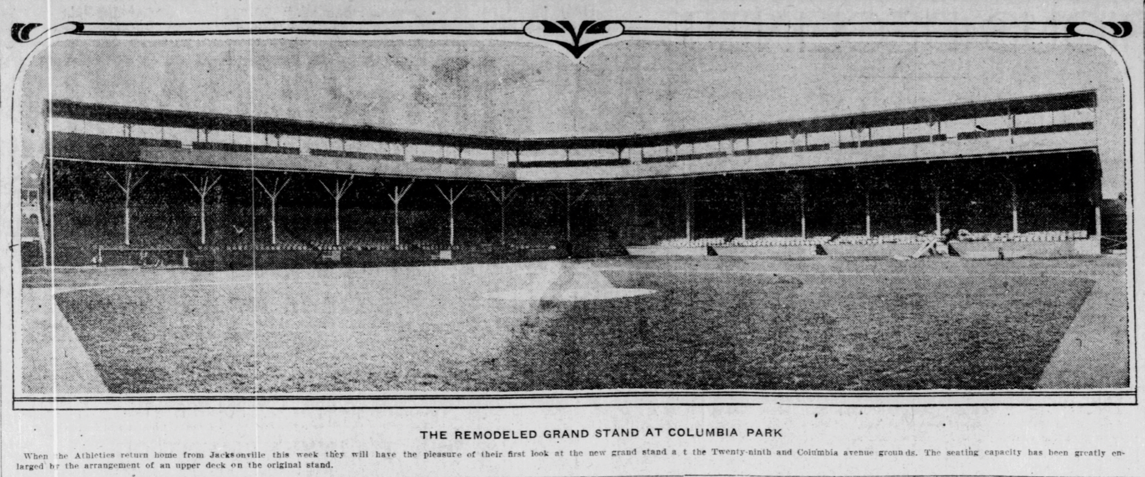 필라델피아 애슬레틱스는 아메리칸 리그 창설과 함께 팀을 창단하면서 홈구장으로 컬럼비아 파크를 건설하였다. 1902년 시즌 후, 애슬레틱스는 야구장 지붕 위에 좁은 상층 데크를 건설했다.[6]