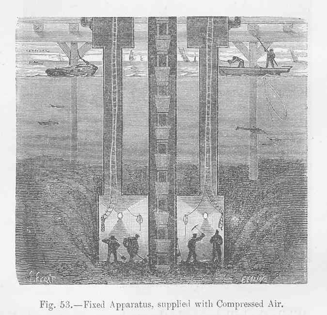 얕은 케이슨은 공기에 개방될 수 있지만, 부드러운 진흙을 관통하는 '''공압 케이슨'''(때로는 '''가압 케이슨'''이라고도 함)은 상단이 밀봉되고 압축 공기로 채워져 깊이에서 물과 진흙을 막는 바닥이 없는 상자이다. 에어록은 챔버에 접근할 수 있도록 한다. 샌드호그라고 불리는 작업자들은 작업 공간 가장자리에서 물이 채워진 구덩이로 진흙과 암석 파편(''muck''라고 함)을 이동시키며, 튜브(''muck tube''라고 함)를 통해 표면과 연결된다. 표면의 크레인은 클램셸 버킷으로 토양을 제거한다. 튜브의 수압은 공기압과 균형을 이루며, 과도한 공기는 흙 튜브를 통해 빠져나간다. 가압된 공기 흐름은 작업자를 위한 정기적인 공기 교환을 보장하고 케이슨 기저부에서 진흙이나 물의 과도한 유입을 방지하기 위해 일정해야 한다. 케이슨이 기반암에 닿으면 샌드호그는 에어록을 통해 나가 상자를 콘크리트로 채워 단단한 기초 교각을 형성한다.[6]
