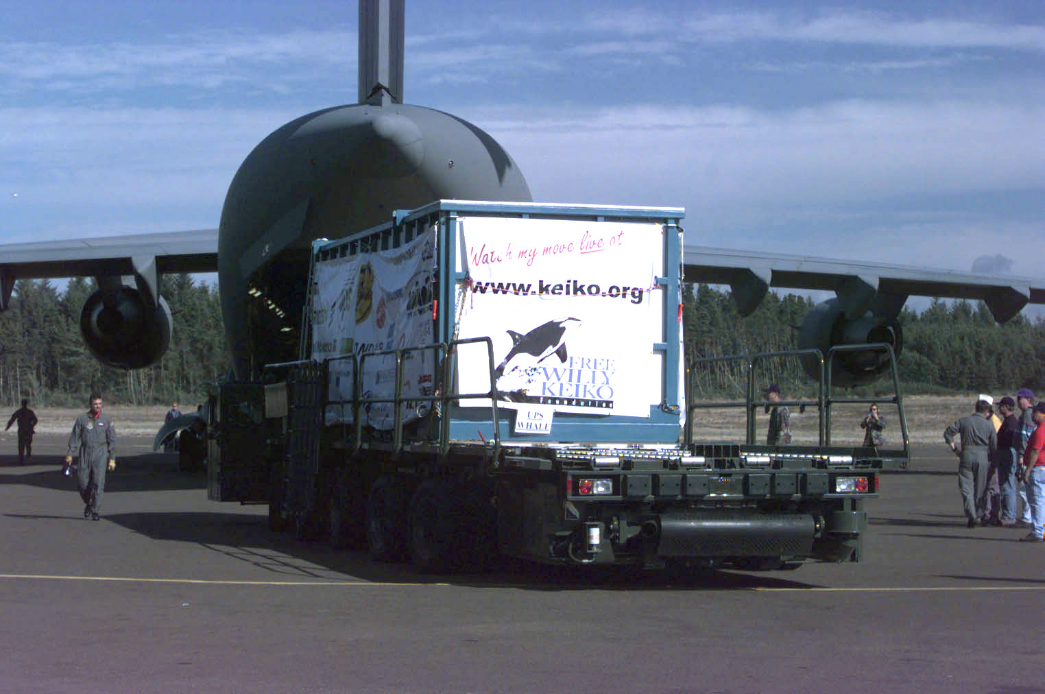당시 케이코의 몸무게는 약 약 3492.66kg였다.[7][8] 1996년 1월 8일, 유나이티드 파슬 서비스(UPS)에서 기증한 록히드 L-100 허큘리스 화물기가 케이코를 오리건주 뉴포트로 수송했다.[8][12]