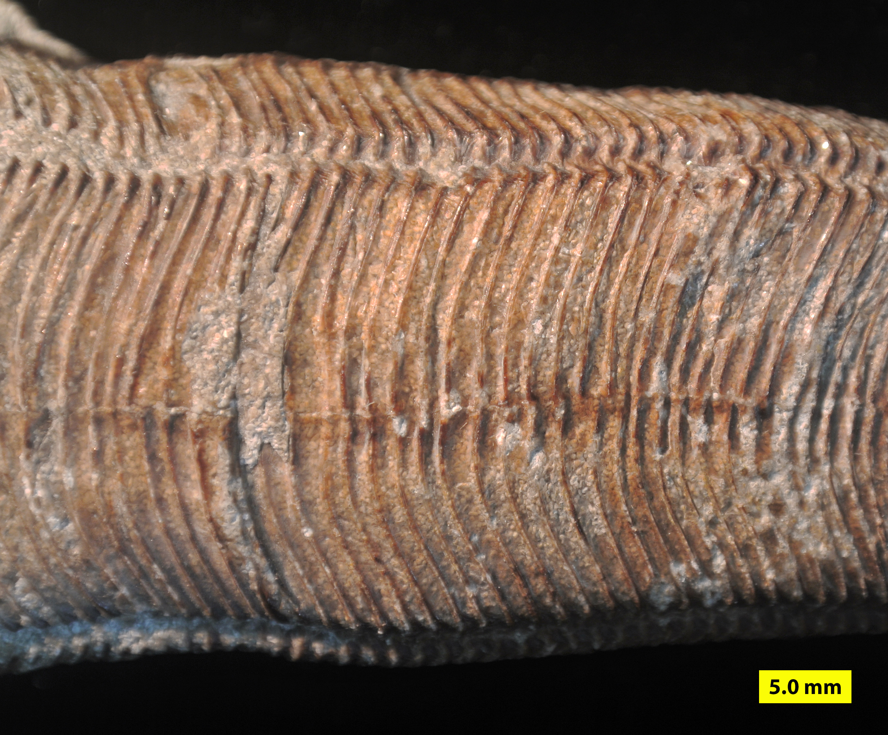 인디애나주 미시시피세의 코눌라리아의 확대 사진, 축척은 밀리미터.