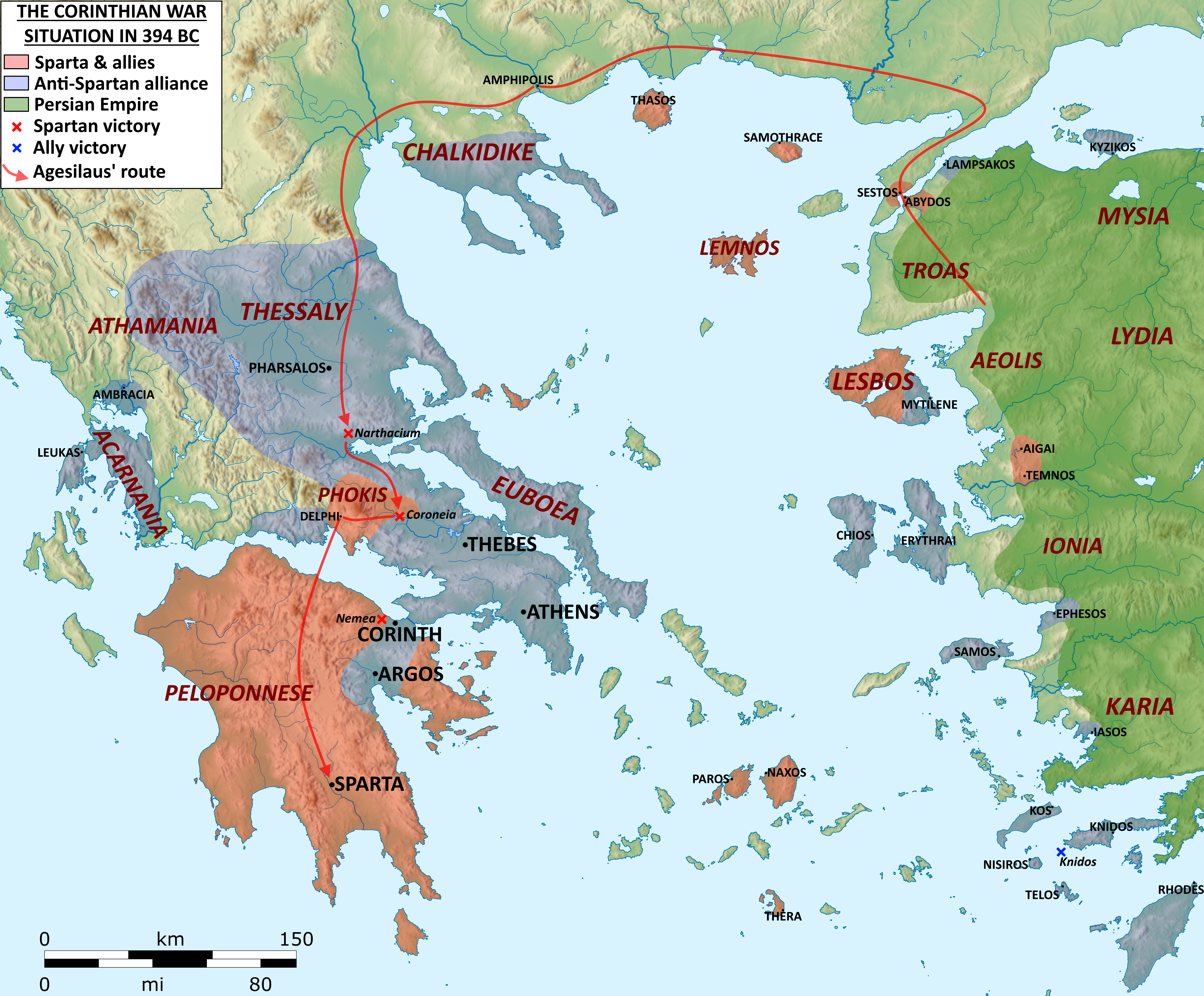 이 시점에 아게실라오스의 군대는 테살리아를 통과하는 행군 중에 테살리아인들의 공격을 물리친 후 보이오티아에 도착했는데, 그곳에서 반 스파르타 동맹의 여러 국가에서 모인 군대와 마주쳤다. 아게실라오스 군대는 아시아에서 왔으며, 대부분 해방된 헬로트와 만 명의 용병 베테랑으로 구성되었으며, 오르코메누스에서 온 스파르타 부대 절반과 코린토스 만을 건너온 또 다른 부대 절반이 추가되었다. 이 군대는 테베 영토의 코로네이아에서 서로 만났다. (코로네이아 전투) 네메아에서와 마찬가지로 양쪽 오른쪽 날개가 승리했으며, 테베인들이 돌파하는 동안 나머지 동맹군은 패배했다. 나머지 군대가 패배한 것을 본 테베인들은 자신들의 진영으로 다시 돌파하기 위해 대형을 갖췄다. 아게실라오스는 그들의 군대와 정면으로 맞섰고, 그 뒤에 이어진 전투에서 많은 테베인들이 죽었고, 나머지는 간신히 돌파하여 동맹군과 합류했다.[27] 이 승리 후, 아게실라오스는 군대를 이끌고 코린토스 만을 건너 스파르타로 돌아갔다.