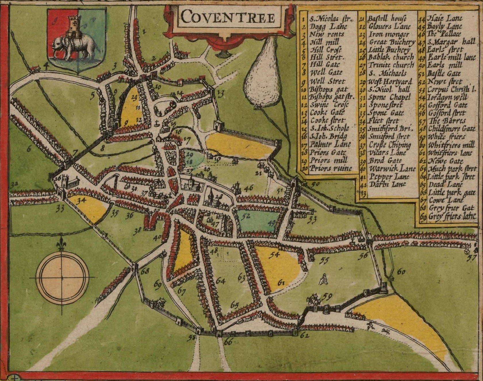 코번트리는 영국 도시 지위(city status in the United Kingdom)를 태고적부터(time immemorial) 주장했으며, 1345년 에드워드 3세 왕에게서 왕실 헌장(royal charter)과 문장(coat of arms)을 부여받았다. 모토인 "''Camera Principis''"(왕자의 방)는 흑태자 에드워드를 가리킨다.[28] 1451년 코번트리 시 카운티(County of the City of Coventry)가 되었고, 1842년 워릭셔(Warwickshire)에 재편입될 때까지 그 지위를 유지했다.[29][30]