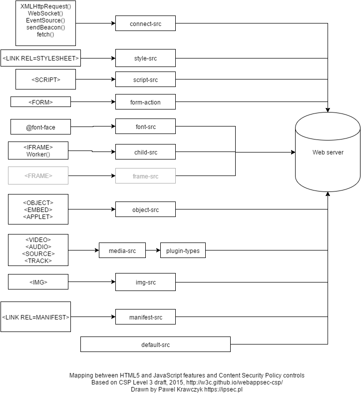 - `X-WebKit-CSP` – 구식. 실험적인 헤더이며 구글 크롬 및 기타 웹킷 기반 브라우저(사파리)에 2011년 도입되었다.[48]