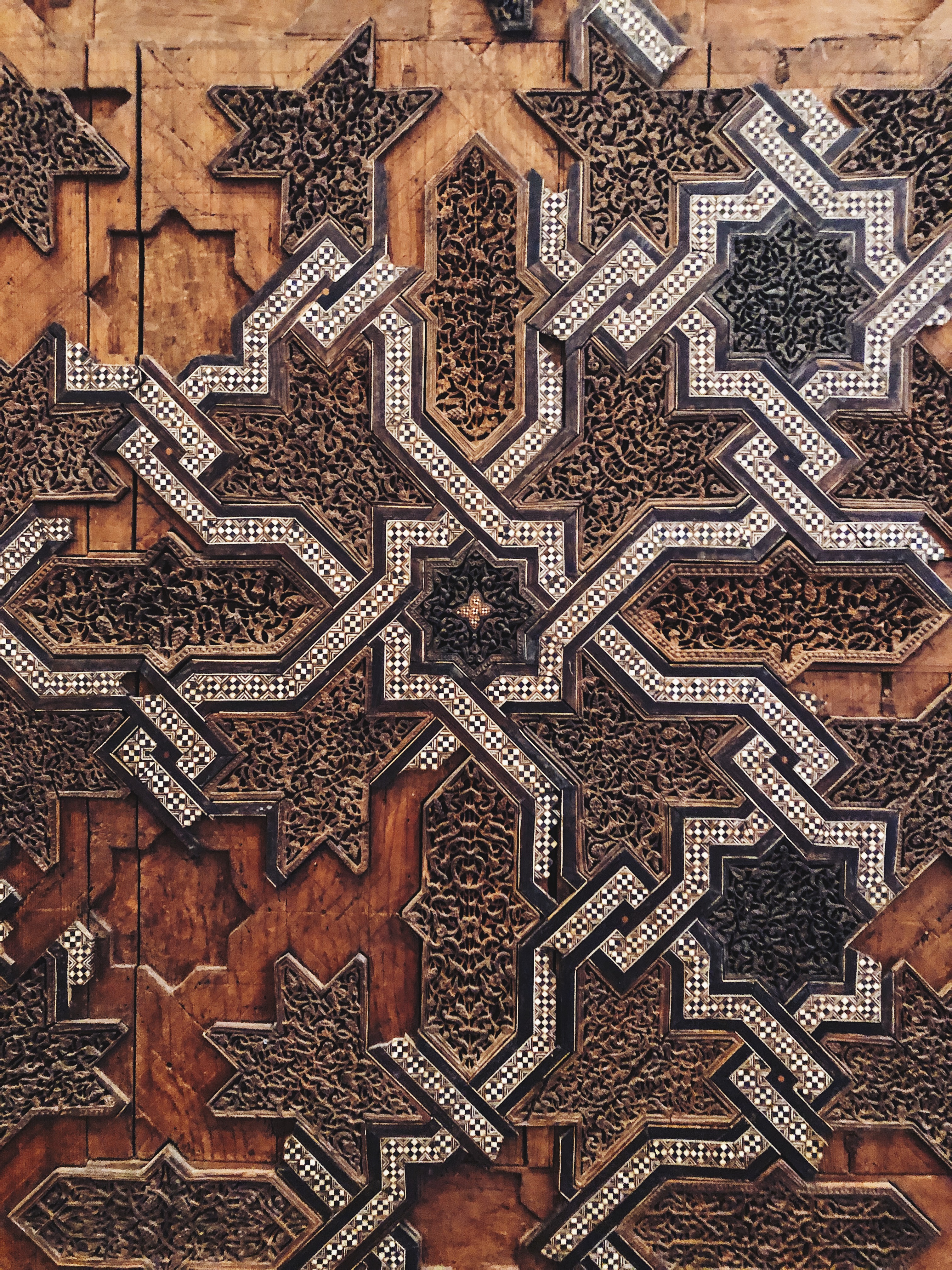 남쪽 키블라 통로는 5개의 정교한 무카르나스 돔으로 장식되어 있다. 미흐라브 앞, 기도실의 남쪽 모서리 두 곳, 그리고 그 사이에 두 개가 더 있다. 무카르나스는 3차원 기하학적 구성을 갖춘 수백 개의 작은 틈새로 구성된 벌집 또는 종유석 모양의 조각이다.[62]