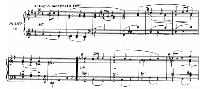 G 장조 알레그로 모데라토, 3/4박자이며, 세도막 형식으로 구성되어 있다.[5] 이 곡은 라벨이 제대 후 요양했던 집의 주인인 장 드뢰퓌스에게 헌정되었다.