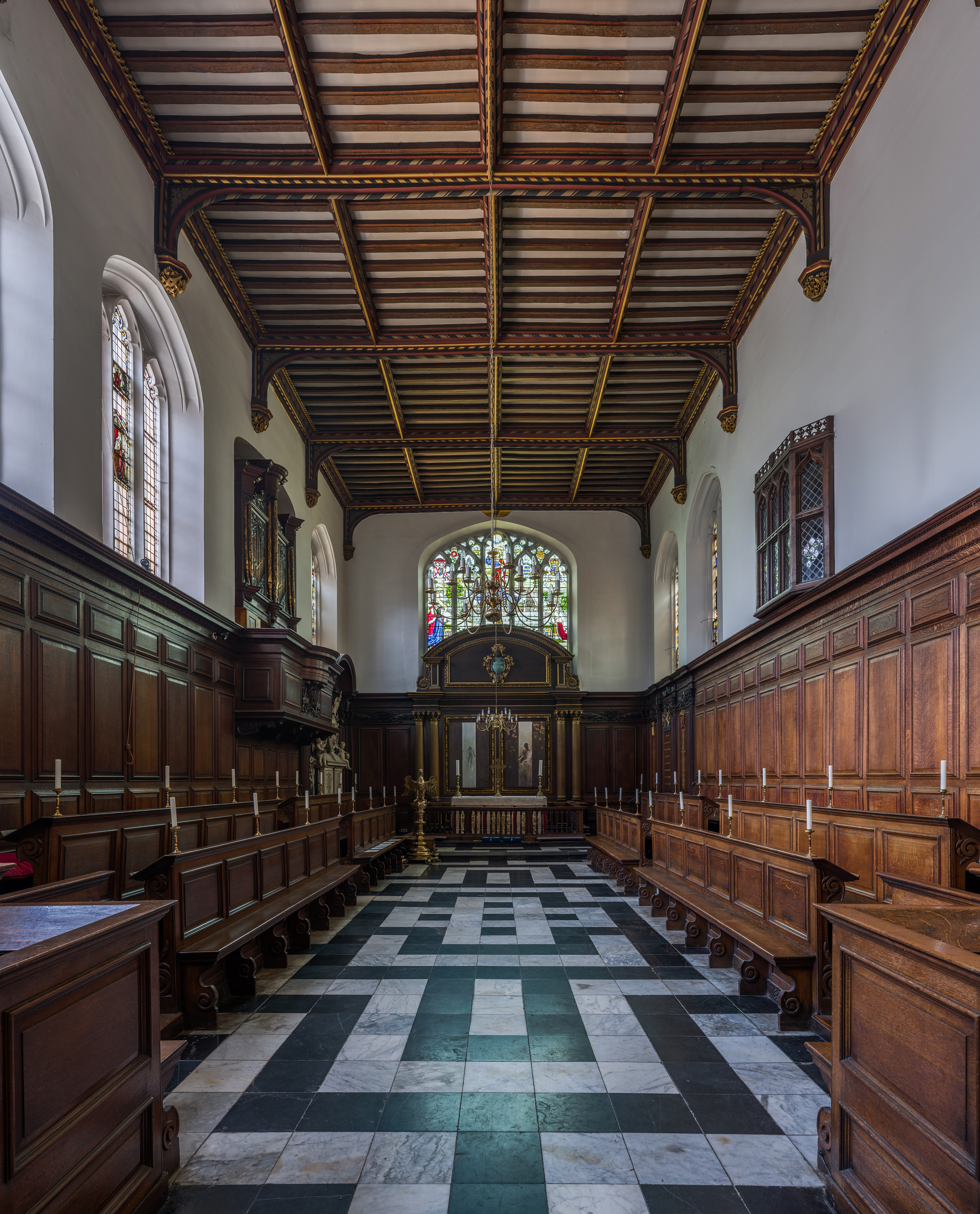 15/16세기 건물들은 현재 퍼스트 코트의 일부를 형성하고 있으며, 예배당, 마스터 로지, 정문 타워가 포함되어 있다. 정문 자체는 불균형적인데, 길의 높이가 높아짐에 따라 하단부가 잘려나갔으며, 이는 정문 타워의 L 계단 아래로 내려가는 계단에서 확인할 수 있다. 16세기 초에 지어진 칼리지 홀은 1875~1879년에 조지 길버트 스콧 2세에 의해 복원되었다. 퍼스트 코트의 잔디밭은 둥근 모양으로 유명하며, 등나무가 마스터 로지의 앞면을 따라 뻗어 있다.