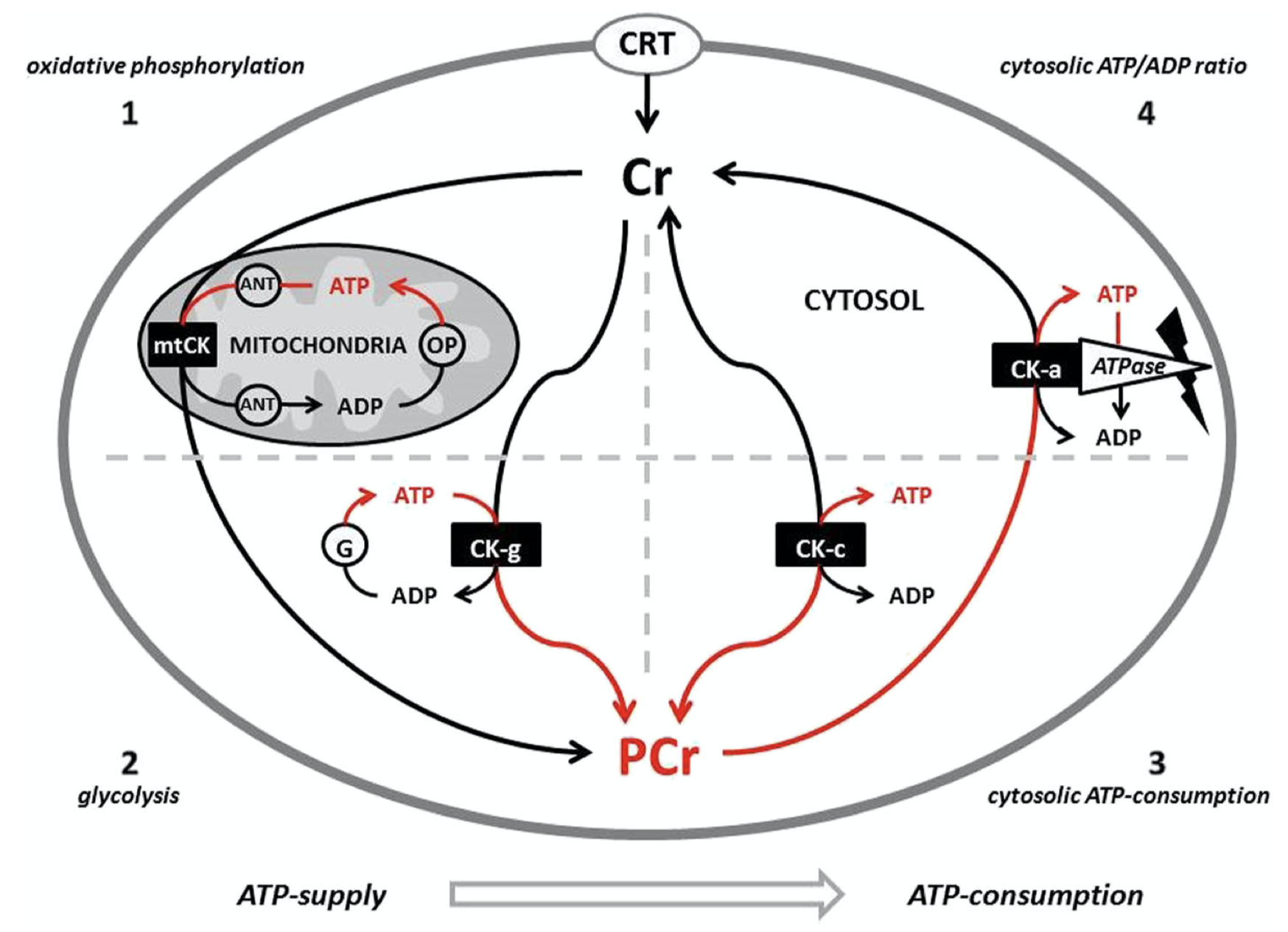 크레아틴은 혈액을 통해 운반되어 뇌와 골격근과 같이 에너지 요구량이 높은 조직에 능동 수송 시스템을 통해 흡수된다. 골격근 내 ATP 농도는 보통 2–5 mM이며, 이는 몇 초 동안의 근육 수축만을 가능하게 한다.[25] 에너지 요구량이 증가하는 동안, 포스파젠 시스템은 크레아틴 키나아제에 의해 촉매되는 가역 반응을 통해 포스포크레아틴을 사용하여 ADP로부터 ATP를 빠르게 재합성한다. 골격근에서 포스포크레아틴 농도는 20–35 mM 이상에 도달할 수 있다. ATP는 포스포크레아틴과 크레아틴 키나아제의 대량 풀에서 지속적이고 효율적으로 보충되기 때문에 세포 내 농도 변화를 감지하기 어렵다.[25] 크레아틴은 근육 내 포스포크레아틴 저장량을 증가시켜 ADP로부터 ATP를 재합성하는 근육의 능력을 잠재적으로 증가시킨다.[26][27][28]