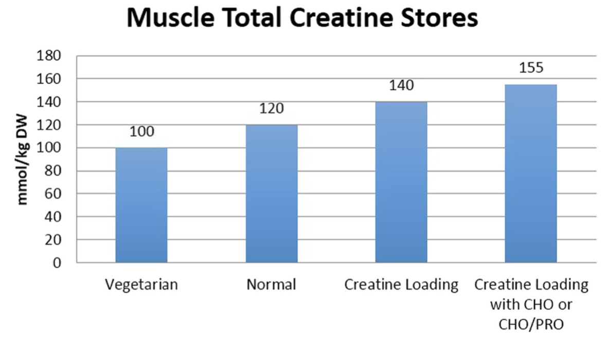 크레아틴은 자연 발생적인 비단백질 화합물이며, 세포 내에서 ATP를 재생성하는 데 사용되는 포스포크레아틴의 주요 구성 요소이다. 인체 전체 크레아틴 및 포스포크레아틴 저장량의 95%는 골격근에서 발견되며, 나머지는 혈액, 뇌, 고환 및 기타 조직에 분포되어 있다.[18][19] 골격근의 일반적인 크레아틴 함량(크레아틴과 포스포크레아틴 모두)은 건조 근육량 1kg당 120 mmol이지만, 보충을 통해 최대 160 mmol/kg까지 도달할 수 있다.[20]