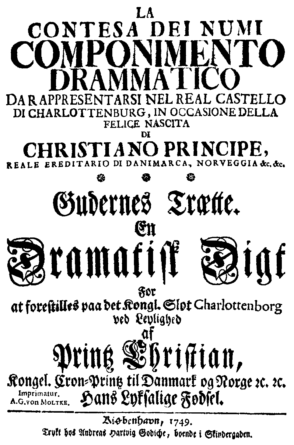 ''라 콘테사 데이 누미''의 대본 표지, 코펜하겐, 1749