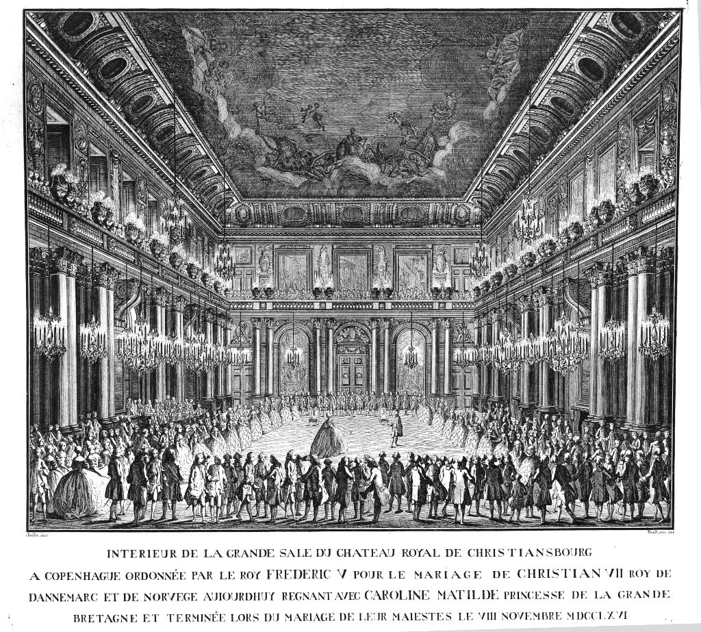 크리스티안 7세와 캐롤라인 마틸다의 결혼식에서 춤을 추는 모습 (프랑스어 비문 새겨짐)
