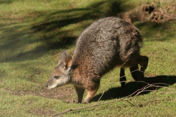 타마왈라비는 왈라비 종 중에서 가장 작은 종 중 하나로, 머리가 작고 귀가 크며 꼬리가 길고 기저부가 두꺼운 것이 특징이다.[12] 등 부위는 짙은 회색을 띠며, 배 부위는 더 옅고, 옆구리와 사지는 적갈색을 띤다.[11] 타마왈라비는 성적 이형성이 뚜렷하게 나타나는데, 수컷의 몸무게는 9.1kg에 달하는 반면 암컷은 6.9kg이다. 수컷의 몸길이는 59cm에서 68cm이고 암컷은 52cm에서 63cm이며, 암수 모두 키는 45cm이다. 꼬리 길이는 수컷이 34cm에서 45cm이고, 암컷이 33cm에서 44cm이다.[12]3. 2. 이동 방식