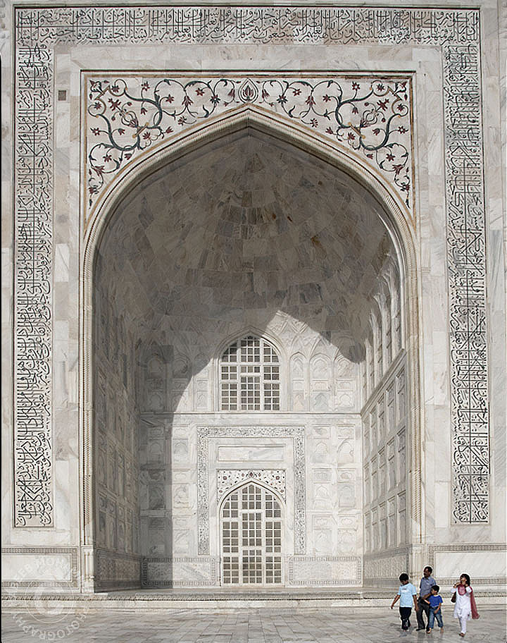 관문 아치는 아랍어 서예로 구절이 있는 코란으로 둘러싸여 있다. 서예는 흰색 대리석 패널에 상감된 자스퍼 또는 검은색 대리석으로 만들어진 화려한 술루스 필체로 구성되어 있으며, 아래에서 볼 때 비틀어 보이는 효과를 줄이기 위해 더 높은 패널에는 약간 더 큰 글씨체로 작성되어 있다.[17] 남쪽 문에 있는 서예는 "오 영혼이여, 너는 안식을 얻었다. 너의 주님께 평화롭게 돌아가라, 그리고 그분도 너와 평화로울 것이다"라는 의미이다. 건물의 서예는 1609년 샤 자한에 의해 "아마나트 칸"이라는 칭호를 받은 압둘 하크에 의해 만들어진 것으로 여겨진다.[16][17] 내부 돔의 바닥에는 "하찮은 존재, 아마나트 칸 시라지가 썼다"라는 비문이 있다.[18]
