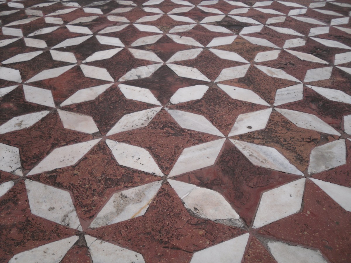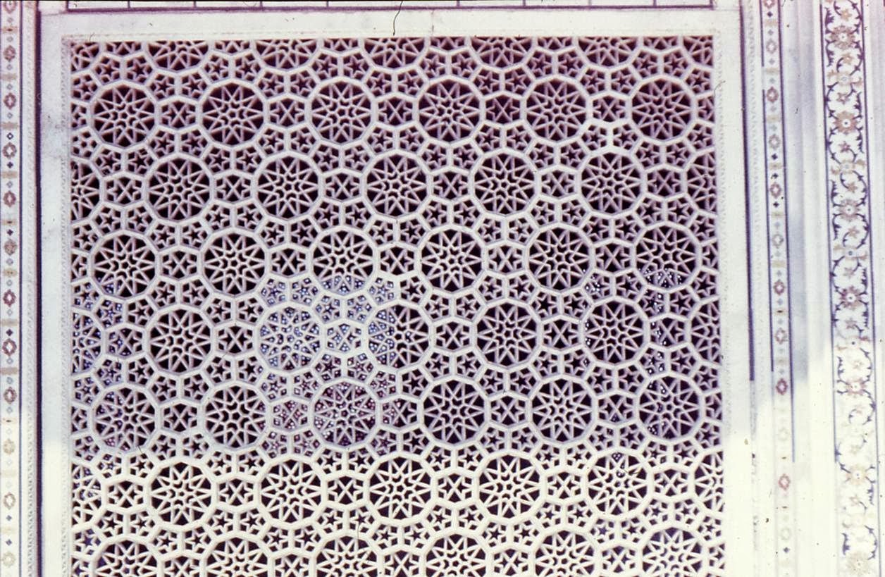 사암 건물의 돔과 궁륭은 정교한 기하학적 형태를 만들기 위해 새김 그림의 트레이서리로 작업되었다. 헤링본 상감은 인접한 요소 사이의 공간을 정의한다. 흰색 상감은 사암 건물에, 어두운색 또는 검은색 상감은 흰색 대리석에 사용되었다.[9] 대조적인 색상은 건물의 회반죽 처리된 부분에 걸쳐 복잡하고 다양한 기하학적 패턴을 만드는 데 사용되었다. 바닥과 보도는 대조적인 색상의 타일이나 블록으로 깔려 있으며, 다양한 테셀레이션 패턴으로 구성되어 있다. 기단은 네 개의 뾰족한 별 모양의 붉은 사암으로 만들어진 8각형 흰색 대리석 조각의 맞물리는 패턴으로 주 플랫폼의 포장된 표면과 구분된다. 건물에는 맞물리는 육각형 패턴의 많은 격자 창문 또는 ''자리''가 있다.[15]