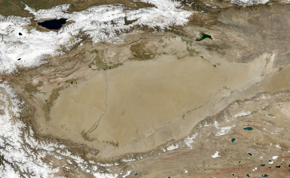 타클라마칸 사막은 면적이 337000km2로, 독일보다 약간 작다.[11] 이 사막은 1000km 길이, 400km 너비의 타림 분지의 일부이다.