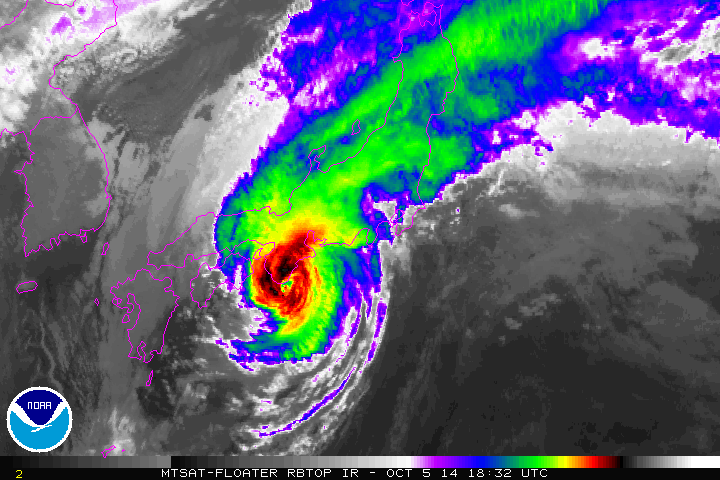10월 5일 9시 야쿠시마 남남동쪽 해상에서 중심 기압 945hpa, 최대 풍속 40m/s의 대형으로 강한 태풍 세력을 유지했고,[56] 같은 날 21시 아시즈리곶 남쪽 해상에서 중심 기압 945hpa, 최대 풍속 40m/s를 기록했다.[56] 10월 6일 8시경 시즈오카현 하마마쓰시 부근에 상륙했으며,[56] 같은 날 11시 도쿄도 23구 부근을 북동쪽으로 진행했다.[56] 이후 10월 6일 21시, 일본 동쪽에서 온대 저기압으로 변질되었다.[56]