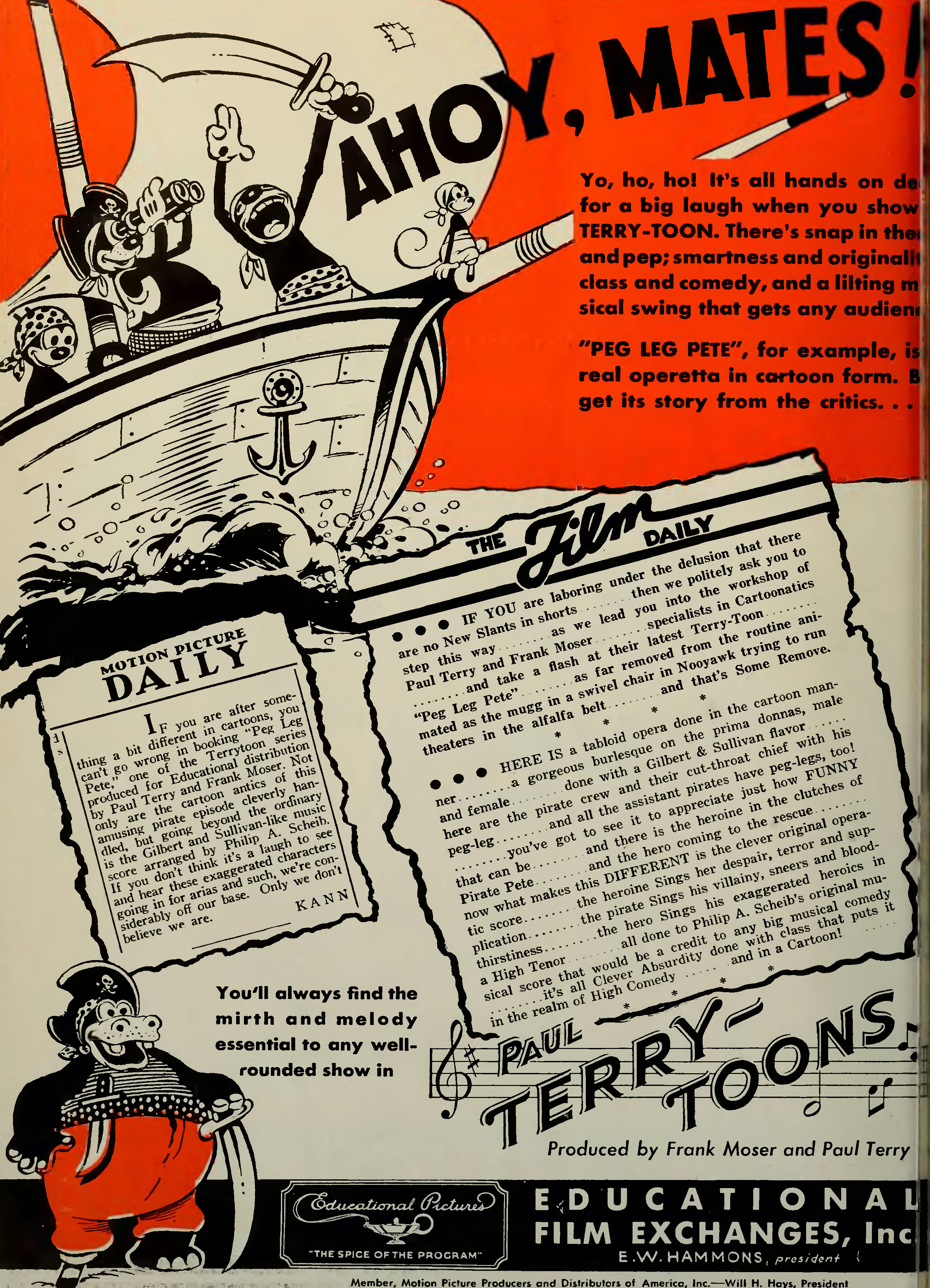 폭스 영화(Fox Film)사는 1930년대에 에듀케이션널(Educational)의 단편 영화를 극장에 배급하여 테리(Terry) 만화가 널리 알려지게 했다. 20세기 픽처스(Twentieth Century Pictures)와 폭스 영화(Fox Film)가 합병 후, 20세기 폭스(20th Century Fox)는 에듀케이션널 픽처스(Educational Pictures)에 대한 지원을 철회했다. 농부 알 팔파(Farmer Al Falfa)는 1930년대 테리의 가장 친숙한 캐릭터였으며, 캥거루 키코(Kiko the Kangaroo)는 농부 알 팔파(Farmer Al Falfa) 시리즈에서 파생되었다. 다른 만화 대부분은 일반적인 동물 캐릭터와 디자인을 사용했으며, 그 중 하나는 눈 주위에 검은 반점이 있는 꾀죄죄한 개였고, 이캐릭터는 현재 퍼디 더 펍(Puddy the Pup)으로 알려져 있다.