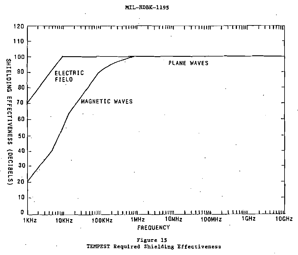 기밀 해제된 문서는 템페스트 표준에서 요구하는 실드에 대한 정보를 제공한다. 군사 핸드북 1195에는 서로 다른 주파수에서의 전자기 실드 요구 사항을 보여주는 차트가 포함되어 있다. 기밀 해제된 NSA 실드 인클로저 사양은 "1 kHz에서 10 GHz까지 최소 100dB 삽입 손실"을 요구한다.[13]