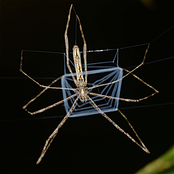 메다마거미과에 속하는 거미는 자신이 분비하는 접착성이 강하고 튼튼한 실로 거미줄을 만들어 먹이에 덮어 씌워 잡는 매우 특수한 매복형 사냥을 한다. 8개의 다리 중 4개의 다리 끝에 거미줄의 가장자리를 걸어 사방으로 늘리면 정사각형의 신축성 있는 그물 덫을 설치한 것이 된다. 이 자세로 매복하여 먹이가 근처를 지나가면 전신을 뻗어 덮쳐 4개의 다리로 펼친 거미줄을 먹이에 덮어 움직임을 봉쇄한다. 그 후에는 보통 거미와 마찬가지로 새롭게 분비하는 실로 완전히 얽어 버린다.