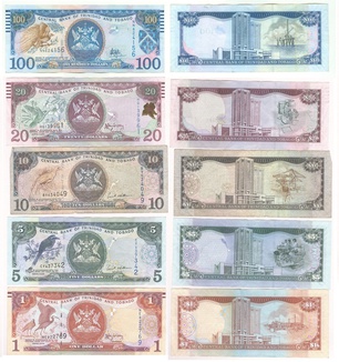 1964년 12월 14일, 트리니다드 토바고 중앙은행(Central Bank of Trinidad and Tobago)은 1달러, 5달러, 10달러, 20달러 지폐를 발행했다.[8] 50달러와 100달러 지폐는 1977년 6월 6일에 발행되었지만, 50달러 지폐는 발행 전에 화물이 도난당한 후 발행이 중단되었다. 50달러 지폐는 짧은 유통 기간 후 회수되었다. 현재 지폐의 뒷면에는 트리니다드 토바고 중앙은행 건물이, 앞면에는 중앙에 국가 문장, 국조, 트리니다드의 장소(시장, 정유 공장 등)가 표시되어 있다. 2002년에는 새로운 1달러와 20달러 지폐가, 2003년에는 새로운 1달러, 5달러, 10달러, 100달러 지폐가 발행되었다.