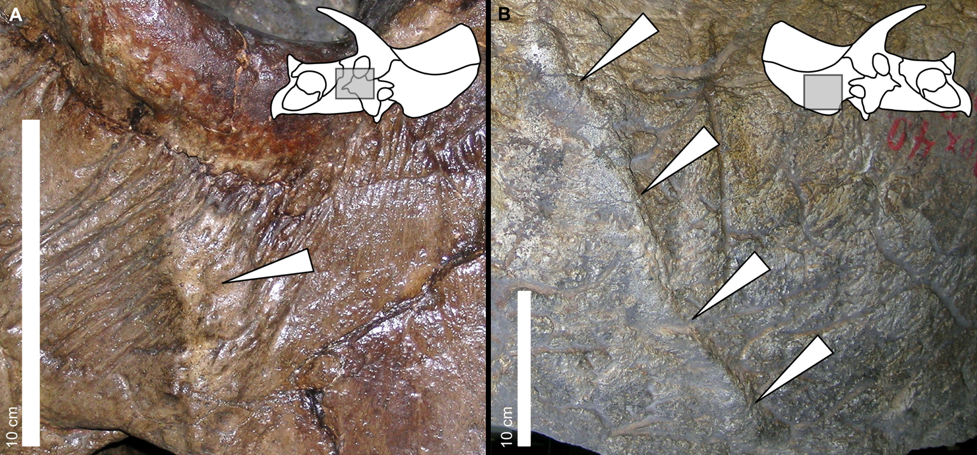 오랫동안 트리케라톱스의 뿔과 프릴이 티라노사우루스와 같은 포식자와 싸울 때 사용되었을 것이라고 생각해 왔다. 트리케라톱스 눈 위의 뿔과 인상골에 티라노사우루스 이빨에 물렸다가 아문 흔적이 발견되기도 했다. 물린 자국이 있는 뿔은 부러졌다가 다시 붙었던 자국도 있다. 피터 도드슨은 티라노사우루스가 수컷 트리케라톱스를 공격했다면 트리케라톱스가 방어에 성공하고 날카로운 뿔을 이용해 티라노사우루스에게 치명적인 상처를 입힐 수 있었을 것이라고 보았다.[215] 티라노사우루스가 트리케라톱스를 잡아먹었다는 증거로는 이빨 자국이 많이 나 있는 트리케라톱스의 장골과 천골이 제시되었다.[167]