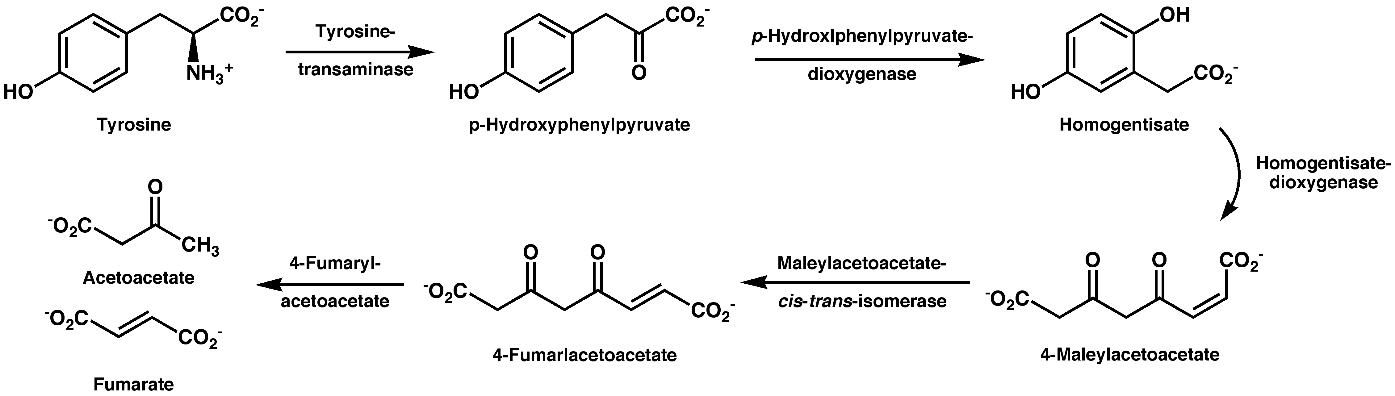 L-티로신(파라-하이드록시페닐알라닌)의 분해는 티로신 아미노기전이효소에 의해 파라-하이드록시페닐피루브산으로 α-케토글루타르산 의존성 아미노기 전이 반응으로 시작된다.[51] ''p''-하이드록시페닐피루브산은 ''p''-하이드록시페닐피루브산 이산소화효소에 의해 CO2를 방출하고 호모젠티스산(2,5-다이하이드록시페닐-1-아세트산)으로 산화된다.[22]호모젠티스산 1,2-이산소화효소는 호모젠티스산의 방향족 고리를 분해하여 4-말레일아세토아세트산을 생성한다. 말레일아세토아세트산 이성질화효소는 글루타티온을 조효소로 사용하여 푸마릴아세토아세트산을 만든다. 푸마릴아세토아세트산 가수분해효소는 물 분자를 첨가하여 푸마릴아세토아세트산을 분해한다.