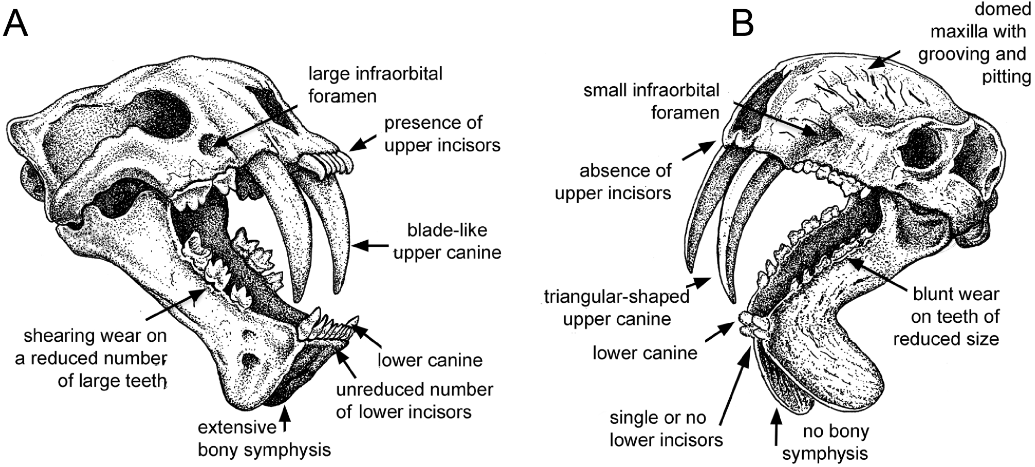 "검치"라는 용어는 매우 긴 위턱 송곳니와 이를 사용하는 데 필요한 두개골 및 골격 적응을 수렴 진화를 통해 독립적으로 발달시킨 다양한 멸종 포식 시냅스류(포유류 및 가까운 친척) 그룹을 아우르는 생태형을 가리킨다. 여기에는 고르곤옵스과, 틸라코스밀루스과, 마케로이데스아과, 님라부스과, 바르보우로펠리스과, 그리고 마카이로두스아과 등이 포함된다.[8]