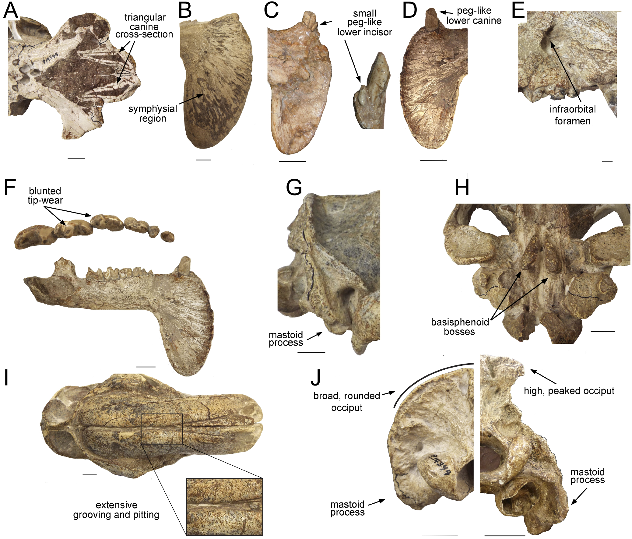가장 두드러진 외형적 특징은 위턱에 매우 길게 발달한 검 모양의 송곳니와, 이 송곳니를 보호하기 위해 아래턱에 발달한 뼈 돌출부(하악 플랜지)이다. 이러한 검치 형태는 다른 검치 포유류와 유사점을 가지면서도 세부적인 구조에서는 차이를 보인다. 또한, 포유류가 일반적으로 가진 앞니(절치)가 없거나 매우 작았던 것으로 추정된다.