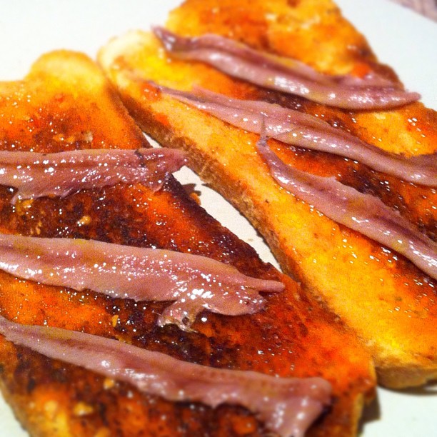 빵 위에는 가지, 파프리카, 양파 등을 구운 채소(에스칼리바다), 멸치 등의 해산물을 올리기도 한다. 그 외에도 보티파라, 푸에트, 초리소 등의 소시지, 햄, 치즈, 오믈렛 등도 곁들인다.