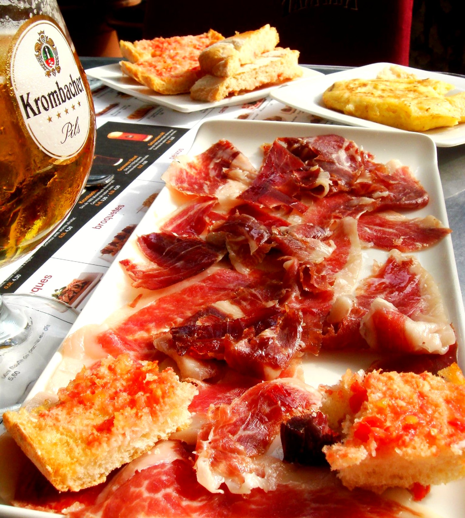 카탈루냐의 레스토랑에서는 토마토 양념을 미리 만들어 빵에 발라 제공하거나, 재료만 주어 손님이 직접 발라 먹도록 하기도 한다.[9] 빵과 토마토 외에 소시지 (보티파라, 초리소, 푸에트, 하몽 등), 햄, 치즈, 오믈렛, 앤초비류의 생선절임, 에스칼리바다류의 구운 야채 등을 곁들여 먹는다.